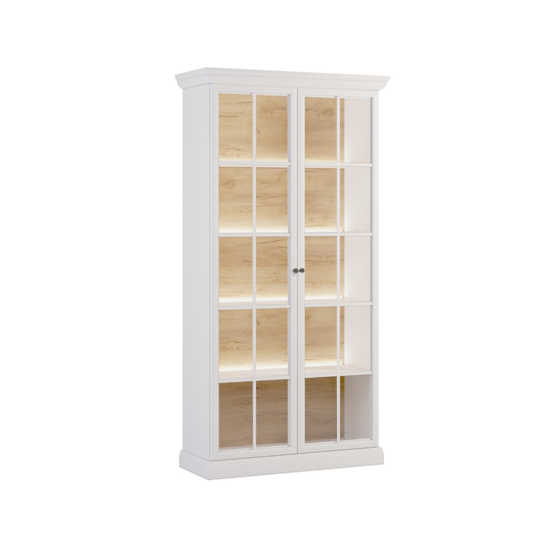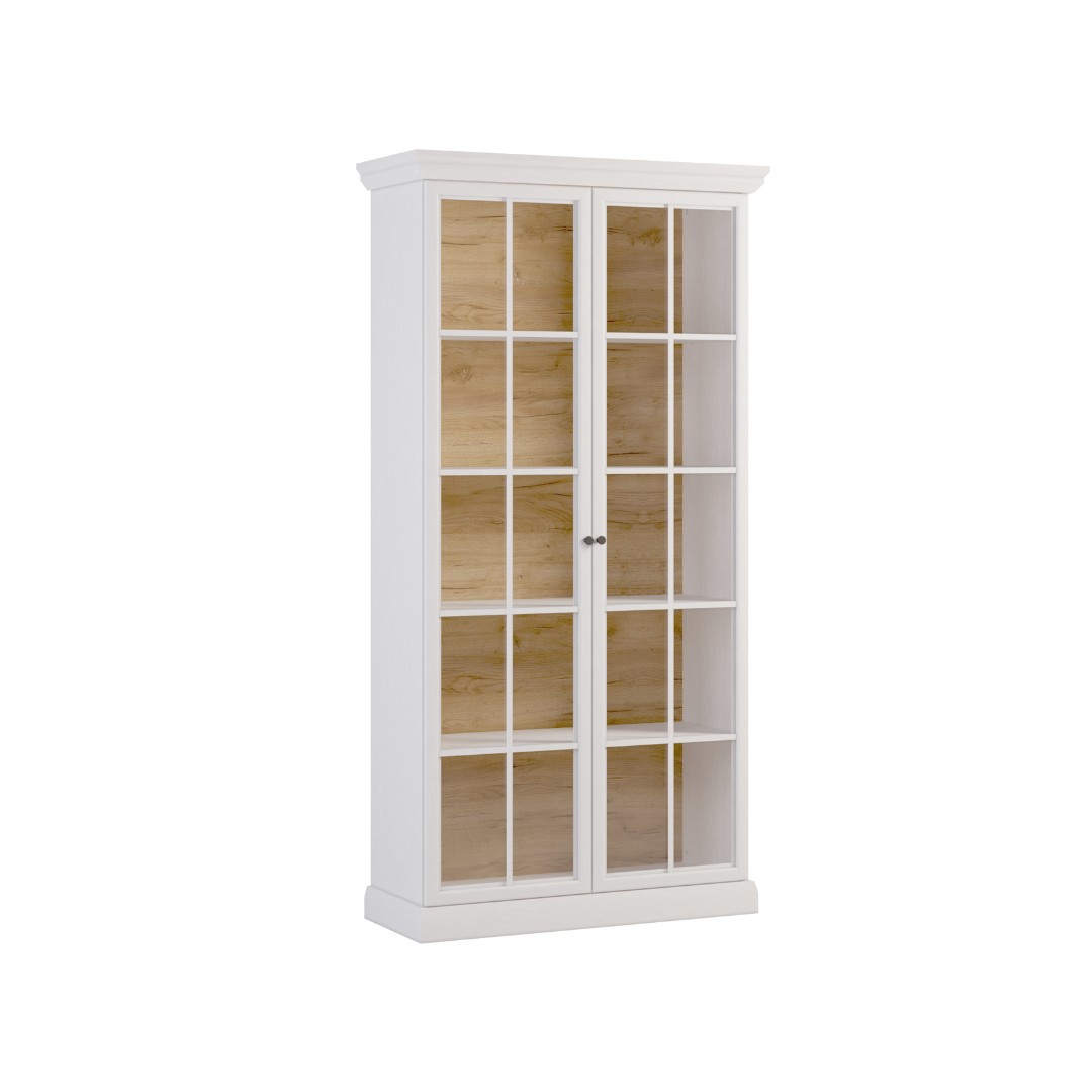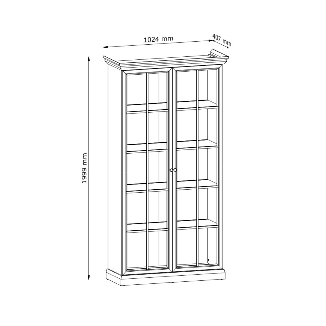Široká vitrína LUCEMBURK W2D s prosklenými dvířky a vnitřními policemi poskytuje elegantní prostor pro vystavení dekorací i praktické uložení oblíbených předmětů. Stylové sokly a kovové úchyty v luxusním černém provedení zvýrazňují její jedinečný design a dodávají jí sofistikovaný vzhled. Dvířka jsou prosklená s dekoračními lištami. V ceně není osvětlení vitríny, je možné dokoupit jej zvlášť - LED osvětlení viz související zboží...