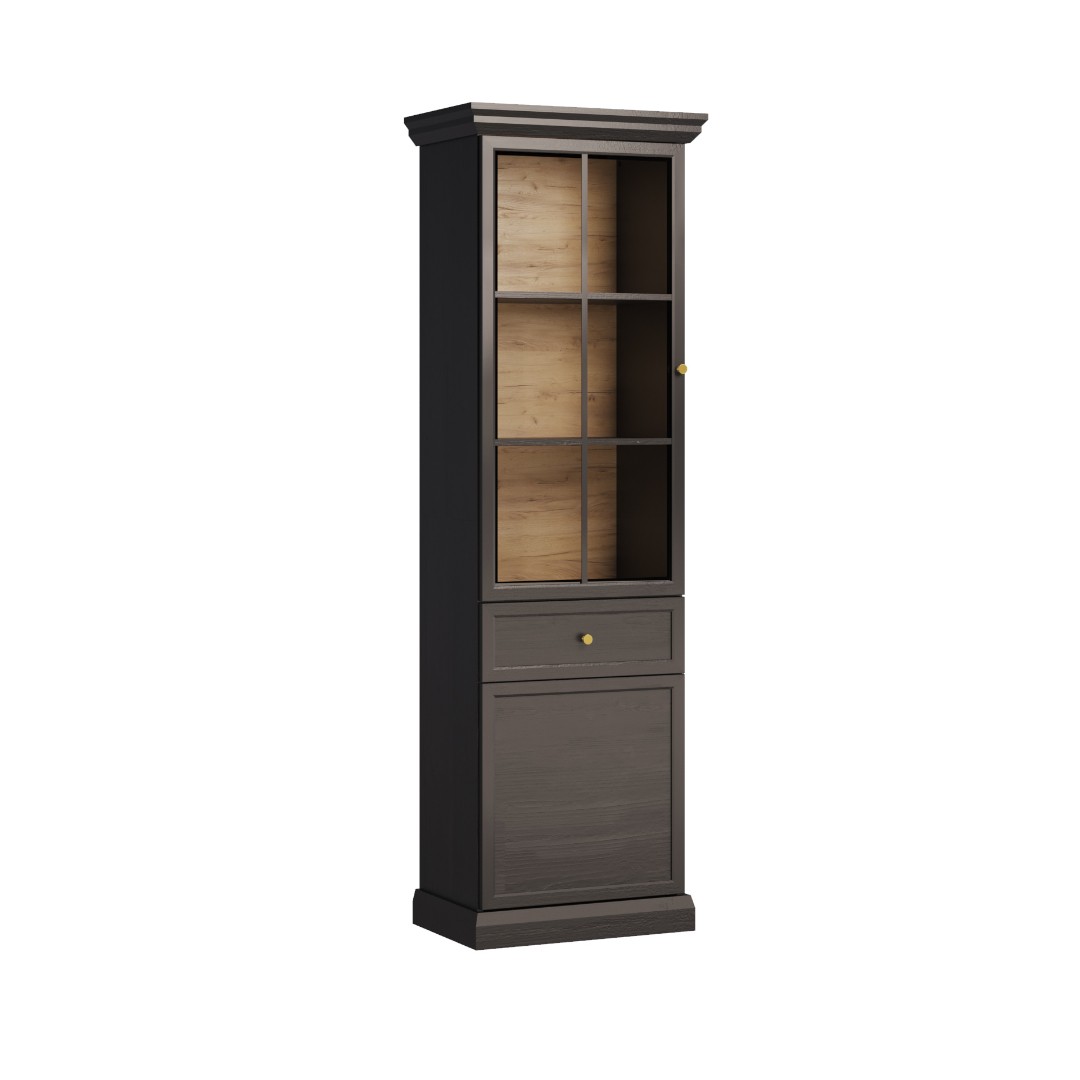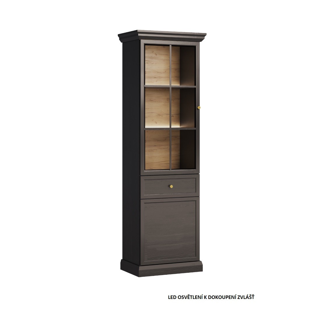 Úzká vitrína LUCEMBURK W2D1S je elegantní řešení pro ty, kdo hledají úložný prostor v atraktivním designu. Horní část tvoří prosklená dvířka, za nimiž se nacházejí praktické police ideální pro vystavení dekorací. Uprostřed vitríny je umístěn jeden šuplík pro drobné předměty a pod ním skříňka s další policí, která poskytne místo na vše, co chcete mít po ruce, ale ne na očích...