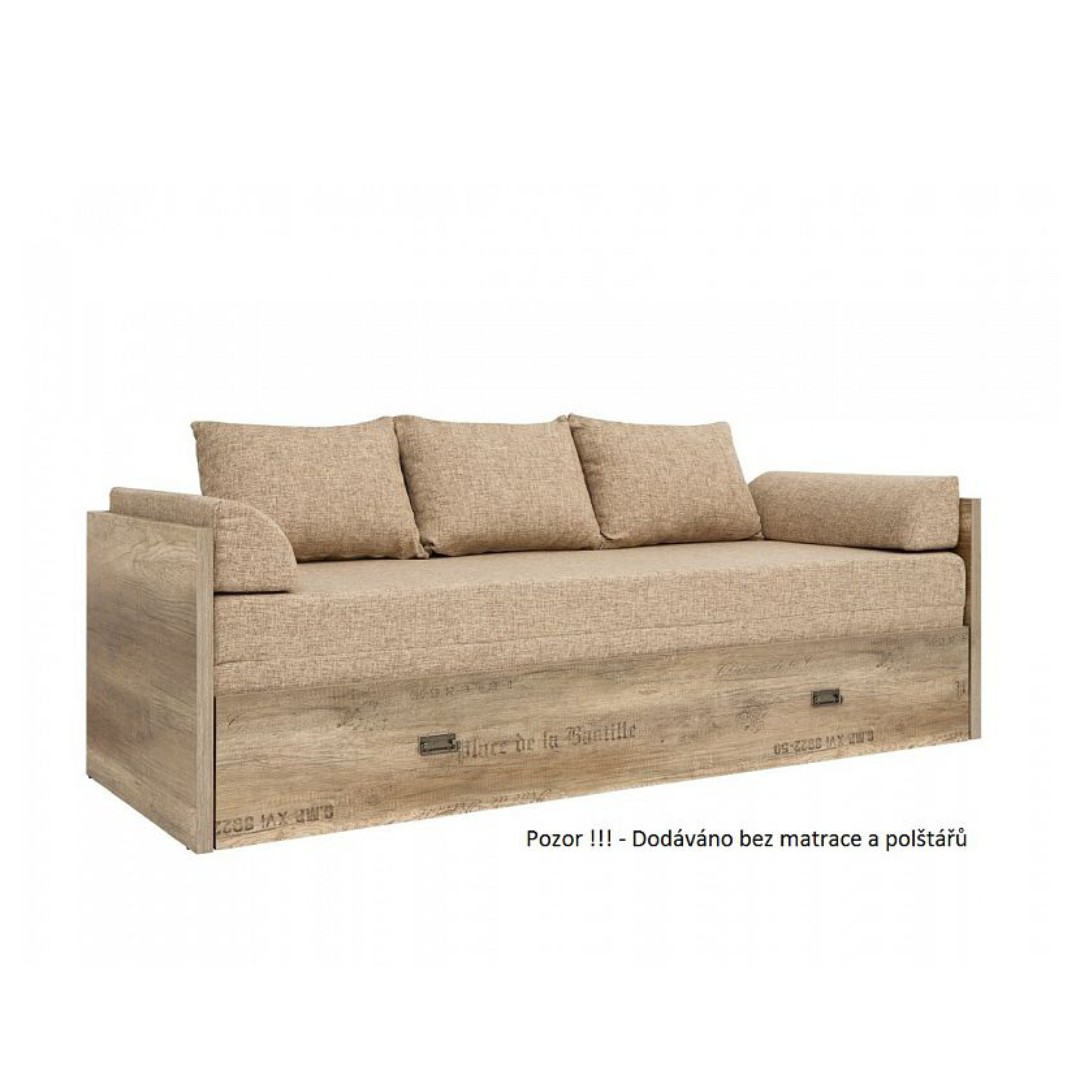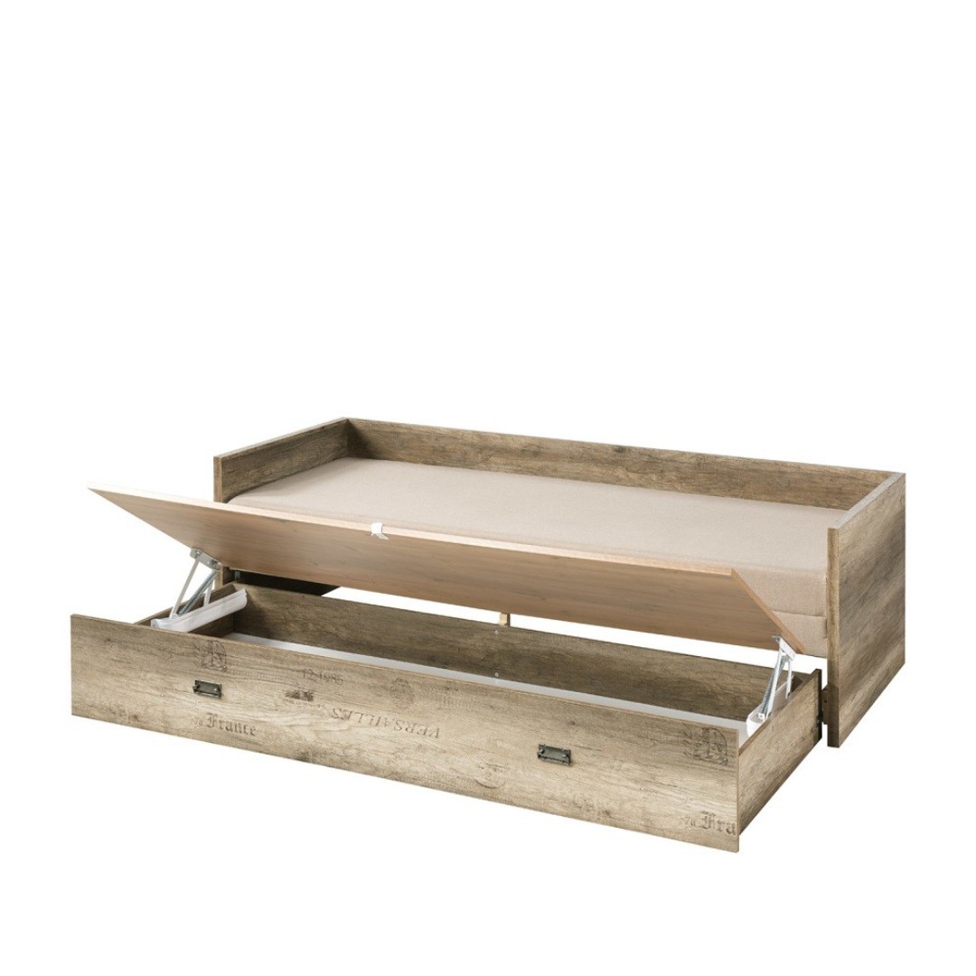 Barevné provedení korpusu je v tónu Dub canyon monument s 3D potiskem. Výsuvná část - zásuvka je na plastových kolečkách a obsahuje úložný prostor na ložní prádlo. Snadná montáž.