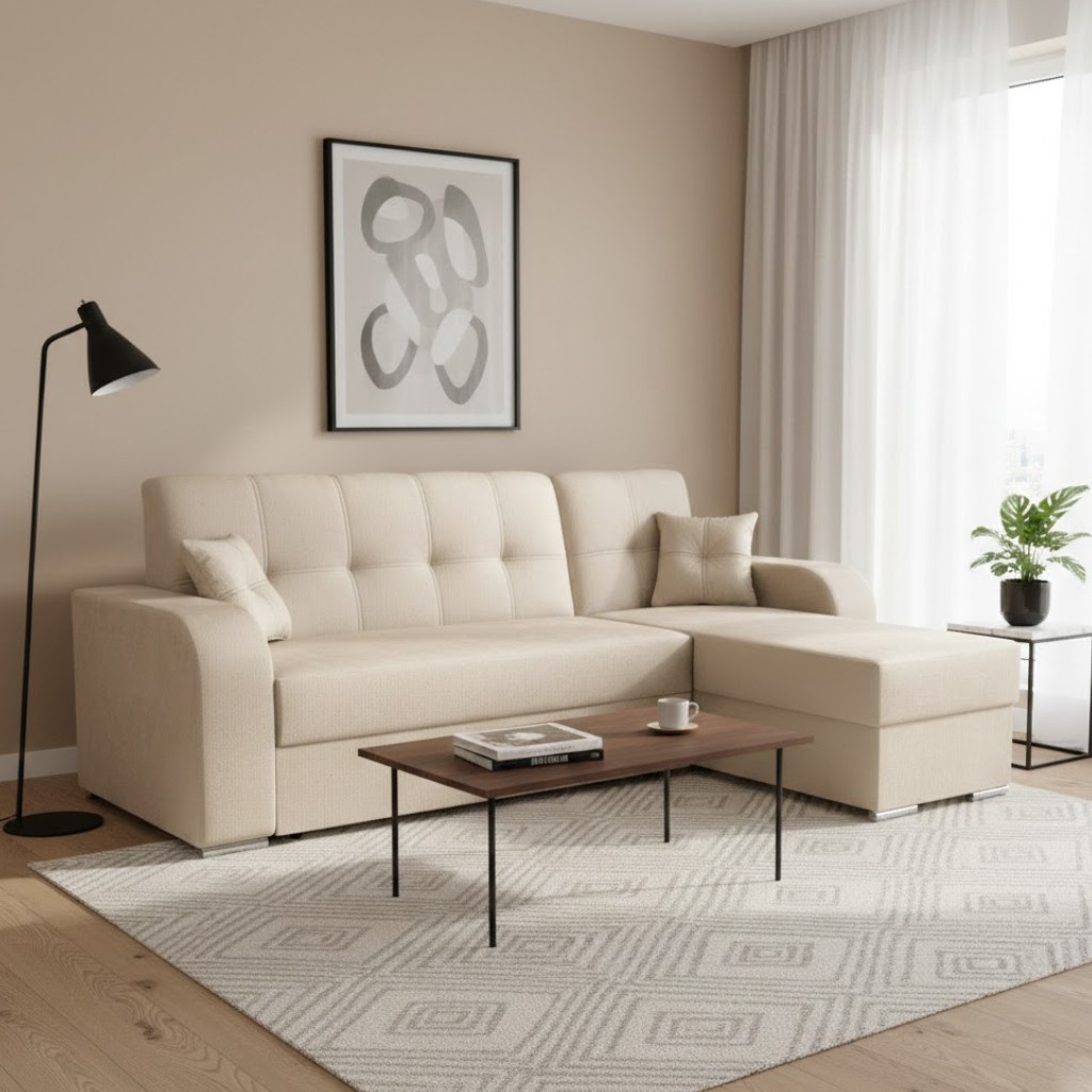Potažena je béžovou potahovou látkou Queens 02. V nabídce také jiné barvy viz barevné varianty. Po rozložení vznikne ložná plocha o rozměru 135 x 190 cm. Čalouněna jsou také záda, proto je možné sedací soupravu umístit do prostoru.
