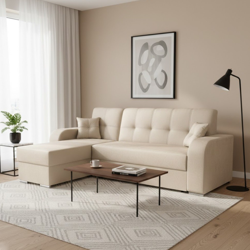 Potažena je béžovou potahovou látkou Queens 02. V nabídce také jiné barvy viz barevné varianty. Po rozložení vznikne ložná plocha o rozměru 135 x 190 cm. Čalouněna jsou také záda, proto je možné sedací soupravu umístit do prostoru.