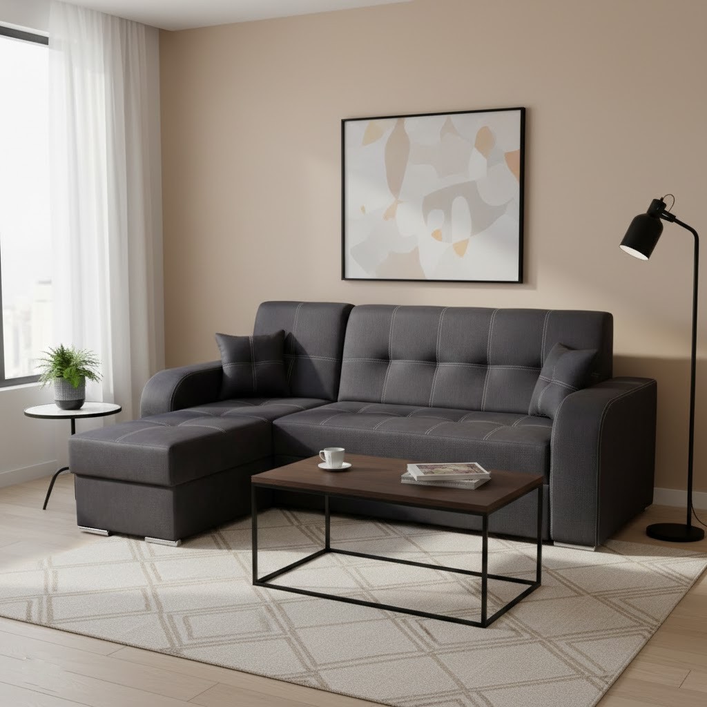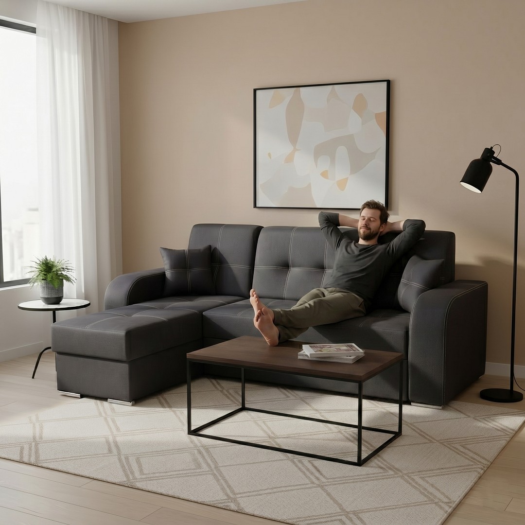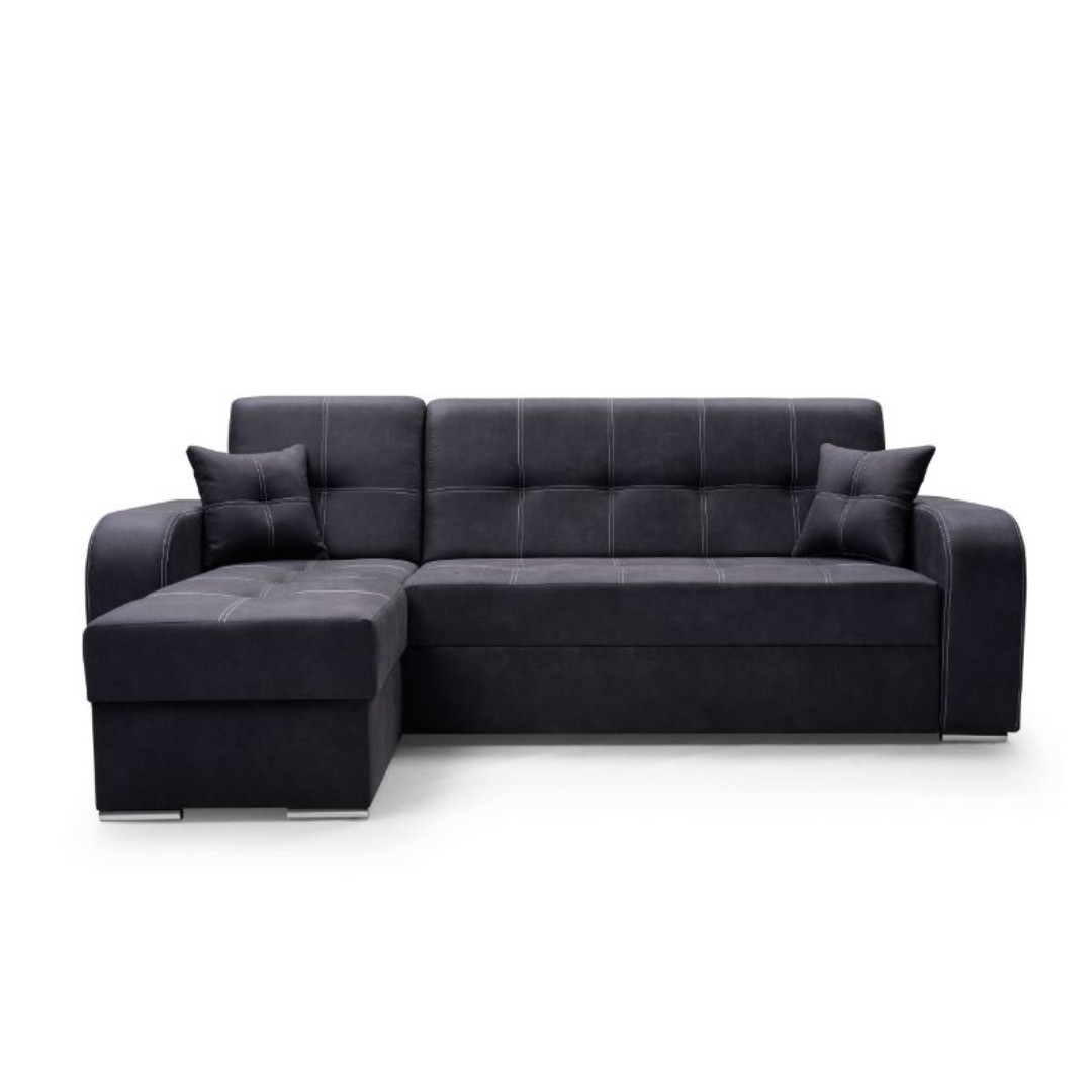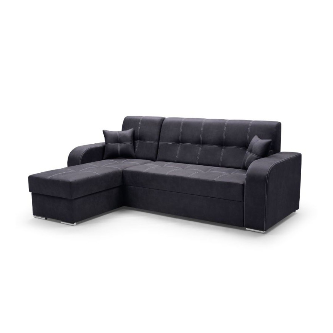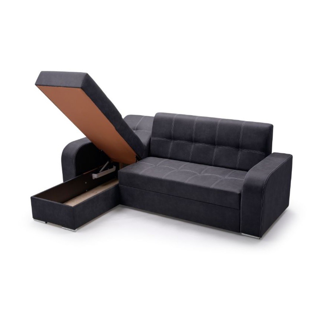 Praktická a elegantní je rozkládací sedací souprava Marajo s úložným prostorem. Rohové provedení je pravé (z pozice sedícího).