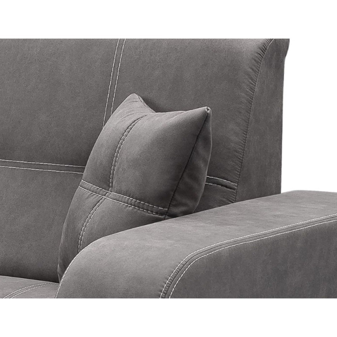 Čalouněna je látkou v šedé barvě - Quens 23 s kontrastním bílým prošitím. Potah je pevný, hladký, velice příjemný na dotek. V ceně jsou i dva praktické, dekorační polštářky. Čalouněna jsou také záda. Vhodné k umístění do prostoru.