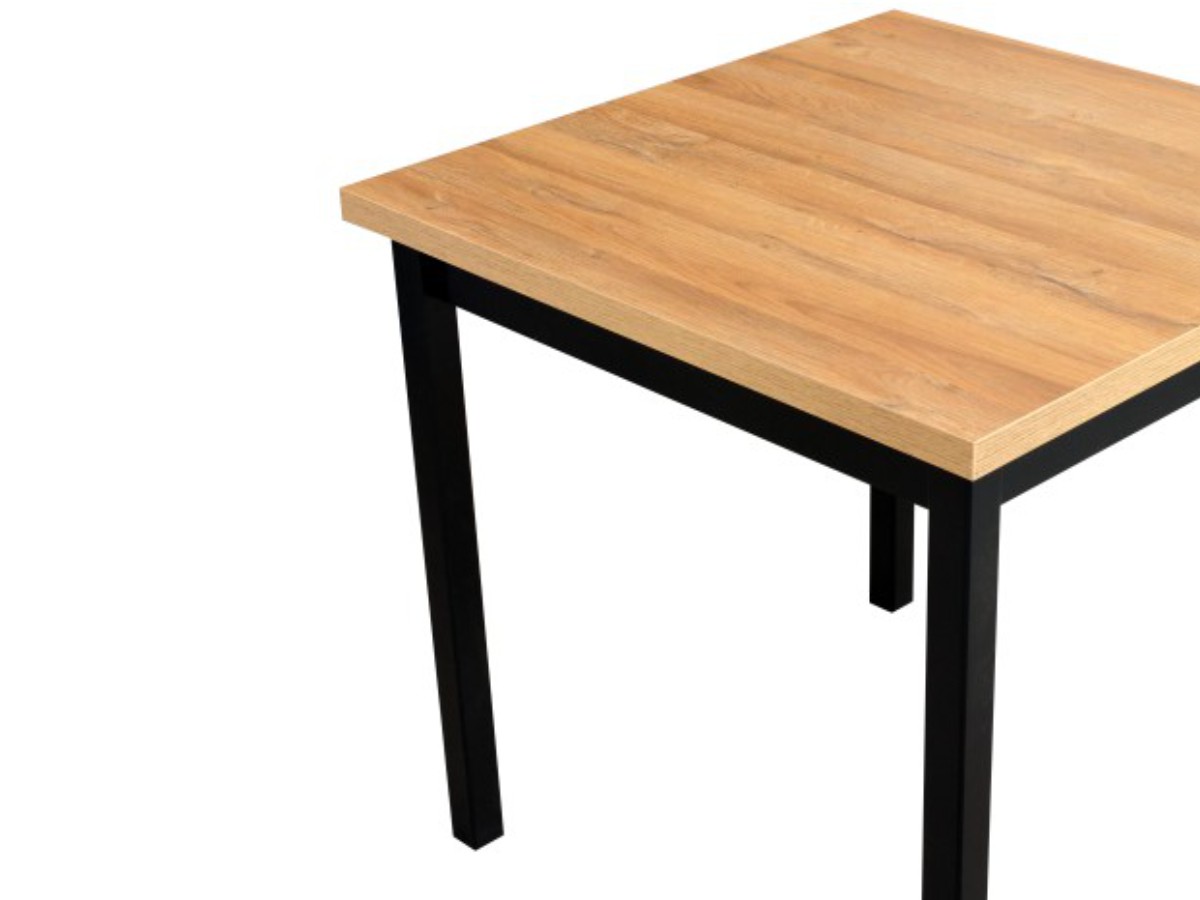 Jeho konstrukce je řešená v klasickém čtvercovém provedení. Materiál použitý při výrobě - lamino v barvě dub grandson/černá, se skvěle udržuje. Jde o barevné provedení, které je velice oblíbené a tak stůl snadno zakomponujete k ostatnímu nábytku.