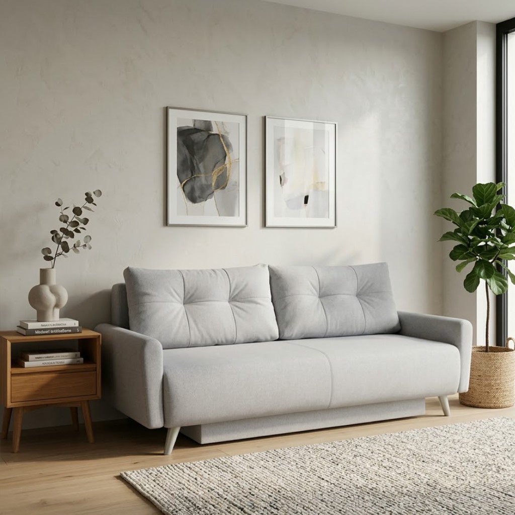 Rozklad je snadný, bez nutnosti odsunutí od zdi. Velikost spací plochy je o rozměrech 150 x 200 cm. Do úložného prostoru můžete uschovat sezónní věci a jiné nezbytnosti.