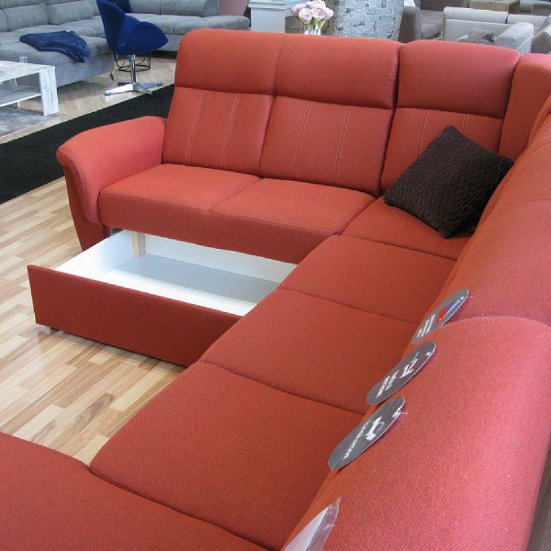 Výška sedu je 47 cm. Hloubka sedu je 53 cm. Délka rohové části s lenoškou je 168 cm. Sedací souprava je určena pro občasné přespání, kdy po rozložení vznikne spací plocha o rozměrech 118 x 260 cm. Sedačka je potažena látkou Primo 52 cihlové barvy.