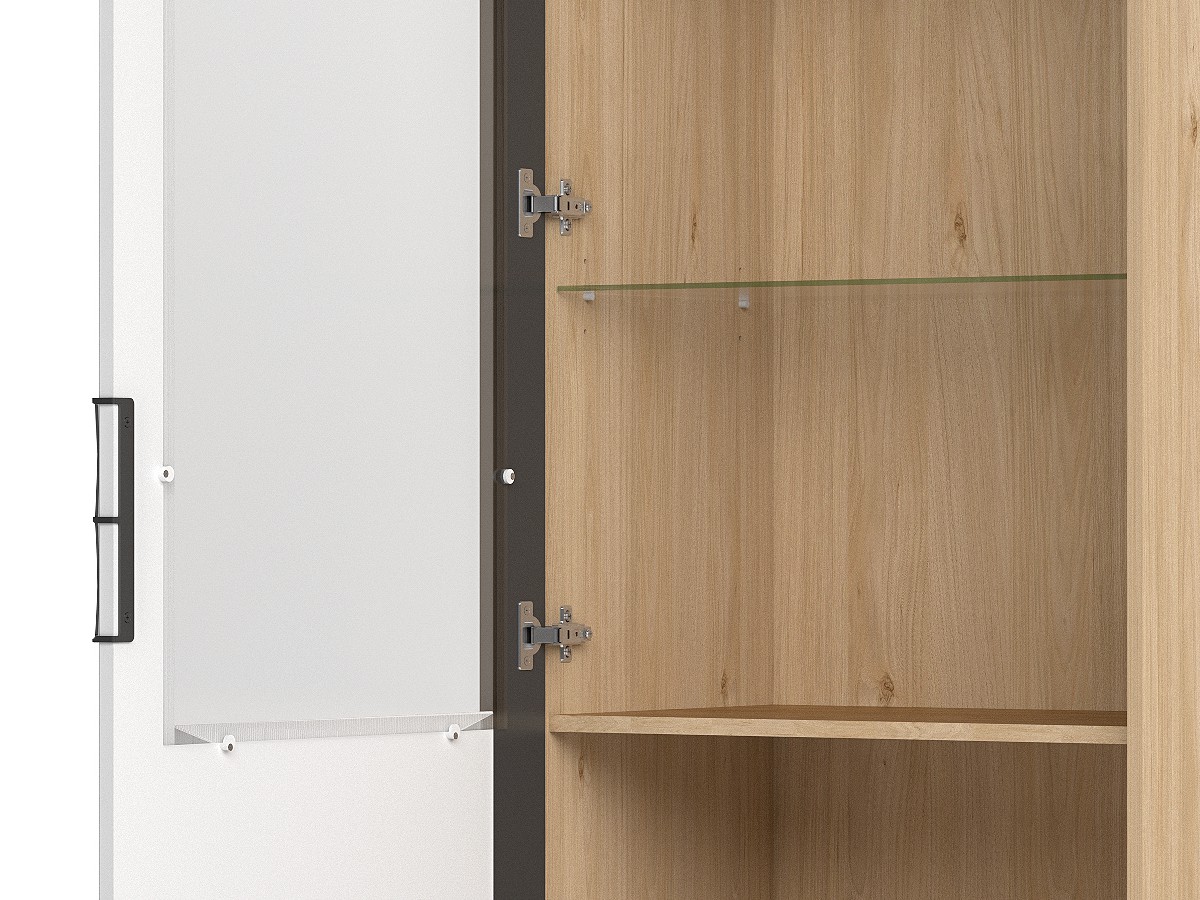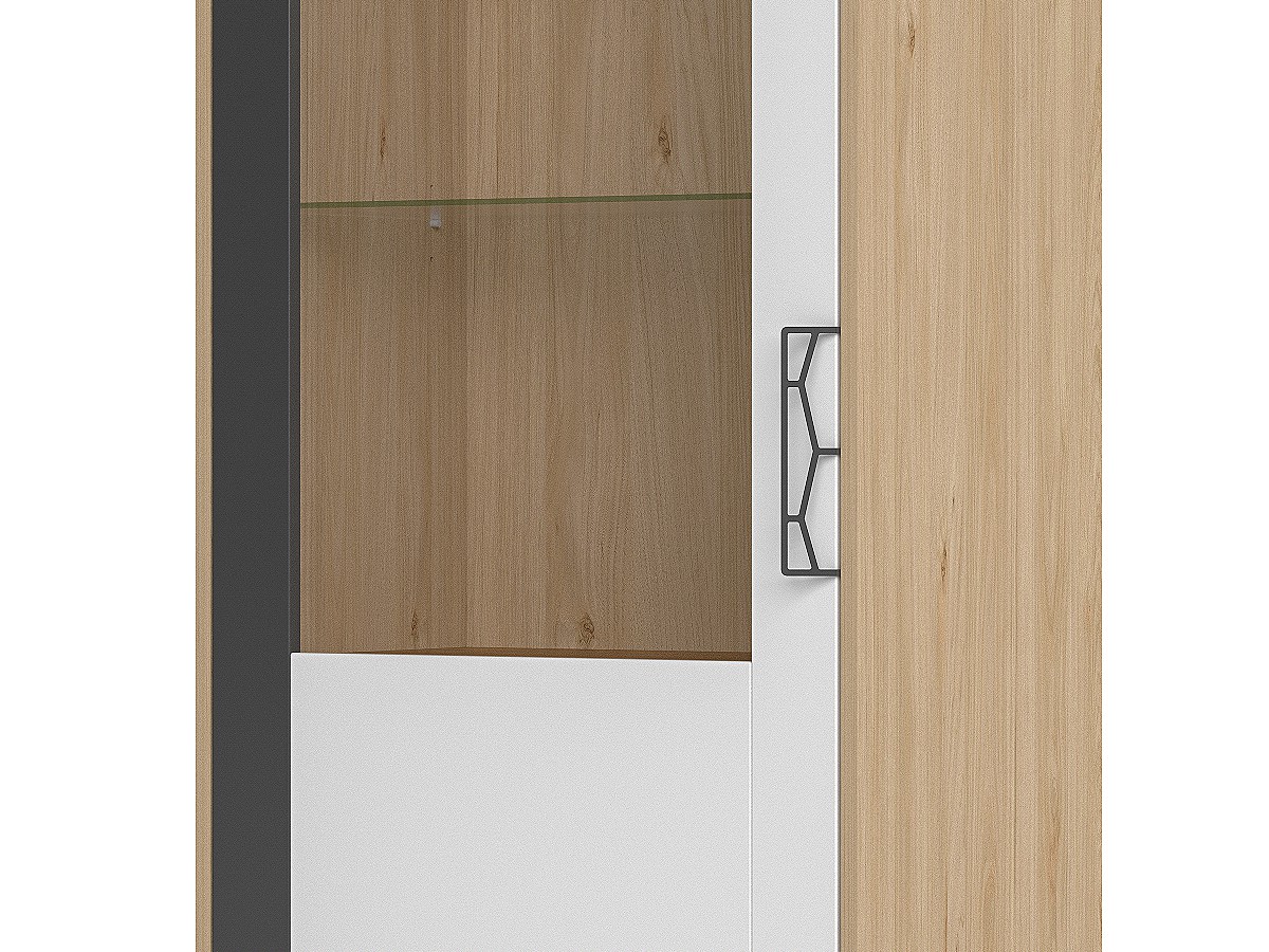 Dvířka vitríny jsou vyplněna tvrzeným sklem, díky kterému je možné vystavit předměty na které bude vidět, a nebude se na ně prášit. Šedý matný úchyt z kovu zajišťuje krásný detail. Panty jsou s tichým dovíráním - Slow Motion.