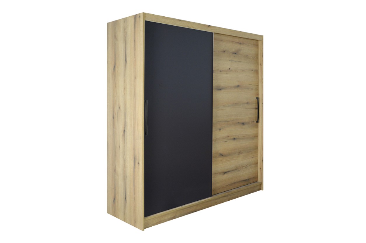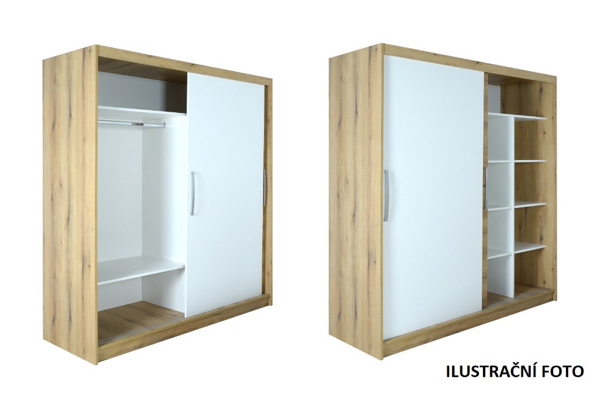 Barevné provedení této stylové skříně je v kombinaci barev dub pobřežný/bílá. Tato barva dodá místnosti svěžest a styl. Posuvné dveře zároveň šetří místo v prostoru. Zajišťují plynulý pohyb a to zejména díky brzdových dotahů. Pro snadnější manipulaci při otevírání je součástí také černá úchytka.