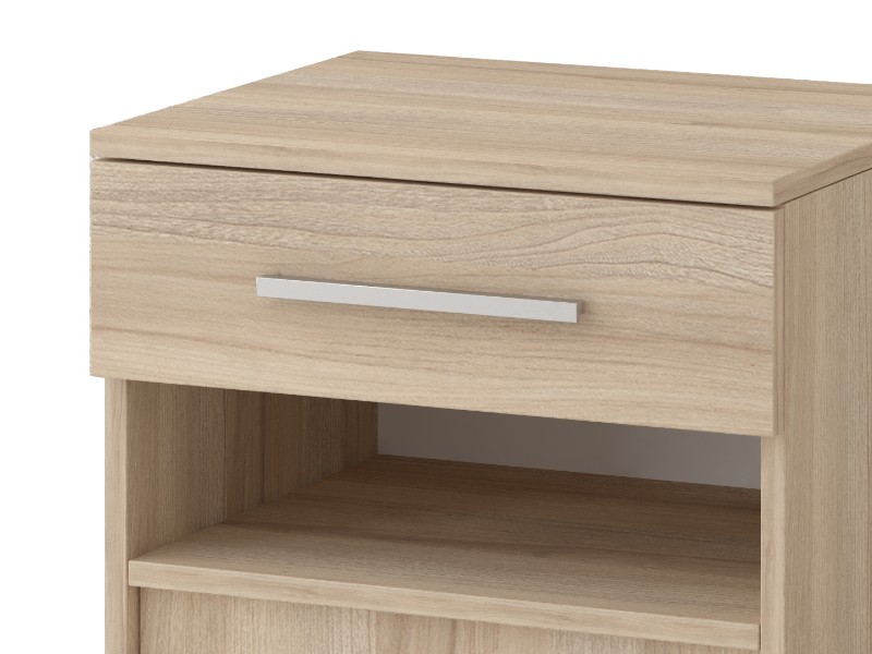 Úložný prostor je v podobě otevřené police a zásuvky s PVC stříbrnou úchytkou, která dodává na praktičnosti celkovému nábytku. Otevřená police je vhodná pro umístění rozečtené knihy, zatímco šuplík je vhodný pro uložení drobností.
