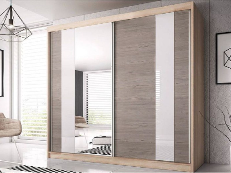 Na posuvných dveřích skříně Murphy je zrcadlo a bílé sklo. Barevné provedení je v kombinaci dub sonoma/bříza.