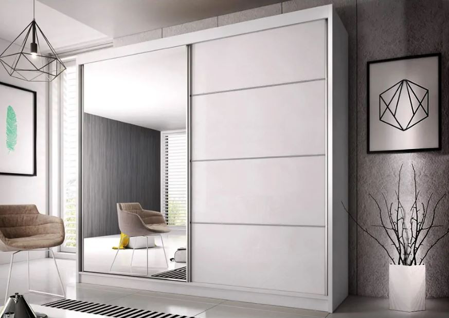 Šatní skříň Murphy 35 je vyrobena v barevném provedení bílá/bílý pololesk. Jedny dveře jsou se zrcadlem, které vám opticky zvětší a projasní místnost. Skříň je vyrobena z odolného lamina 16 mm + ABS hrany, které se snadno udržuje. Úchyty jsou ve stříbrné barvě - plastové.