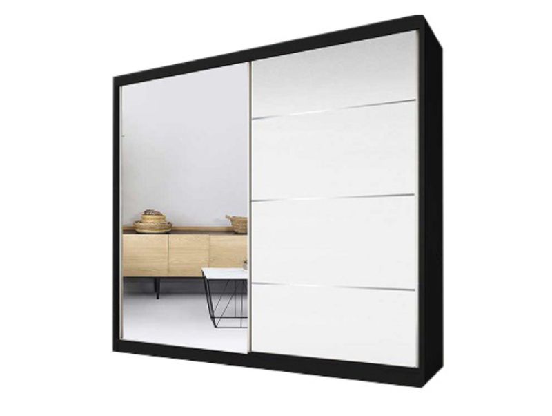 Skříň je vyrobena z lamina 16 mm v barevném provedení černá/bíla pololesk/zrcadlo součástí jsou také ABS hrany. Tento designový dekor vnese do interiéru lehkost, svěžest a díky zrcadlu se prostor opticky zvětší. Ve skříni jsou k dispozici police a šatní tyč.