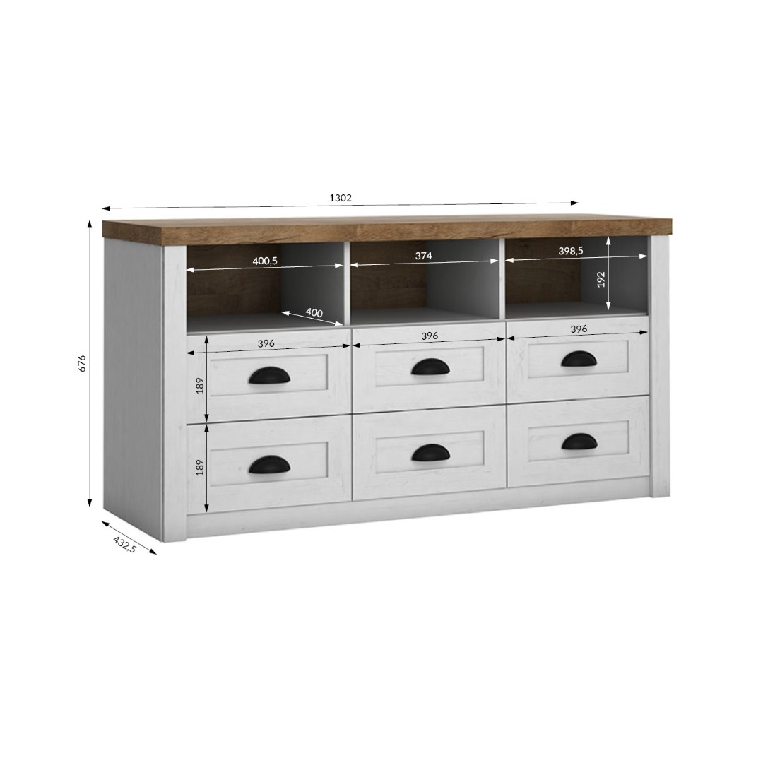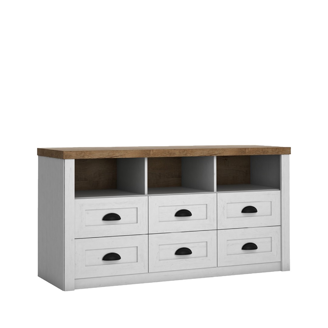 NABILIA K6S přináší do interiéru svěžest provensálského stylu a praktické uspořádání. Ve vrchní části se nacházejí otevřené police, ideální pro vystavení dekorací, knih nebo každodenních doplňků. Pod nimi jsou umístěny praktické šuplíky, které poskytují dostatek prostoru pro přehledné uložení všech potřebných věcí. Součástí šuplíků jsou kovové černé úchytky pro lepší manipulaci při jejich otevírání a zavírání...
