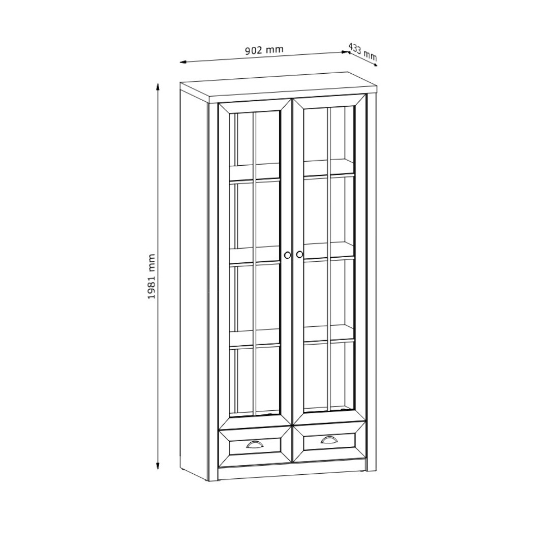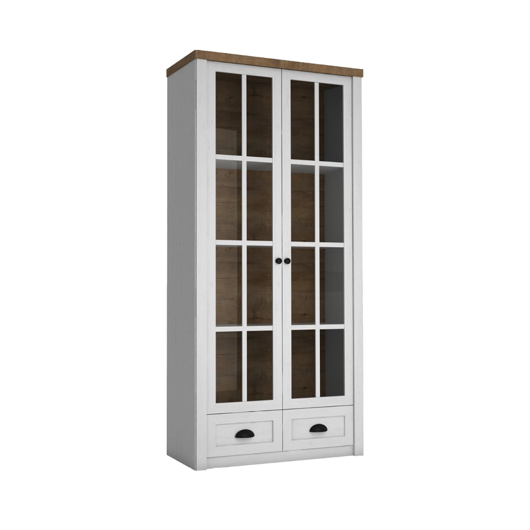 Prosklená dvířka elegantně zvýrazní vystavené předměty, zatímco uzavřená část v podobě šuplíků pomůže udržet vše ostatní přehledně uložené. Dekor borovice andersen/dub lefkas dodává nábytku přirozený, svěží a harmonický vzhled, typický pro kolekci NABILIA.