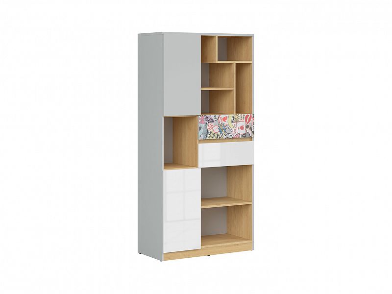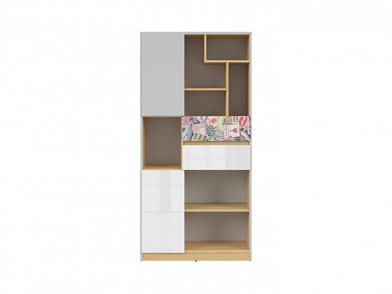 Úložný prostor je rozdělený do několika praktických částí v podobě skříněk, polic a zásuvek. Čelo vrchní zásuvky je navíc k dispozici v několika originálních variantách – můžete si vybrat mezi jemnou texturou arabesky nebo čistou bílou barvou, díky čemuž si regál snadno přizpůsobíte podle svých osobních preferencí a zbylého vybavení pokoje.