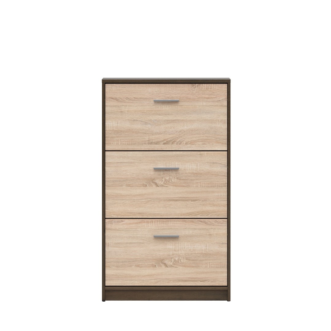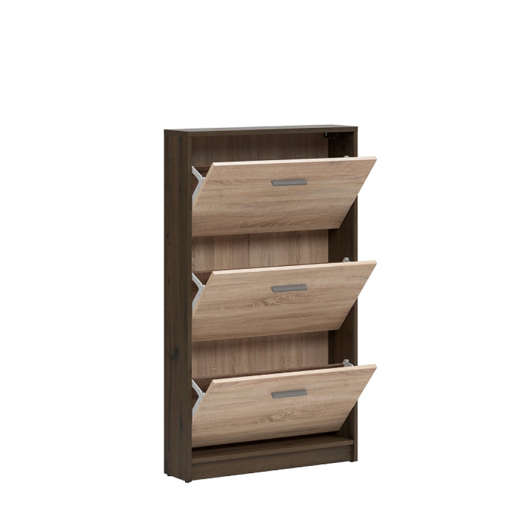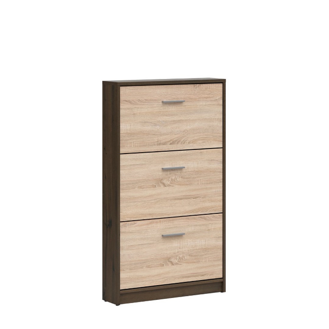 Botník se skládá ze tří boxů s výklopnými čely. V každém z boxů budete mít k dispozici úložný prostor o délce 65 cm. Úchytky jsou vyrobené z tvrzeného plastu. Pro zajištění bezpečnosti při užívání botníku, doporučujeme botník připevnit ke zdi (viz. montážní návod).