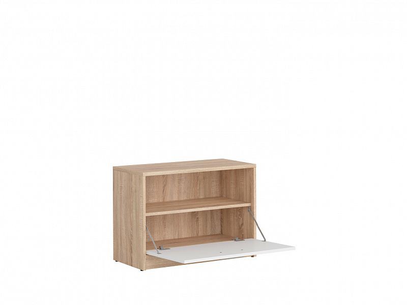 Vnitřní prostor botníku je rozdělen jednou policí. Dvířka jsou výklopná směrem dolů, umožní tak snadný přístup k obuvi. Stříbrná úchytka je vyrobena z tvrzeného plastu.