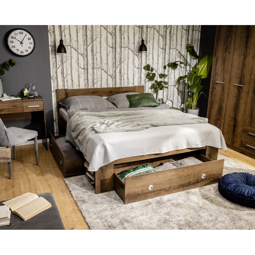 Základem pro výrobu postele je kvalitní lamino o síle 1,9 a 1,6 cm v žádaném tmavě hnědém dekoru Dub Monastery.