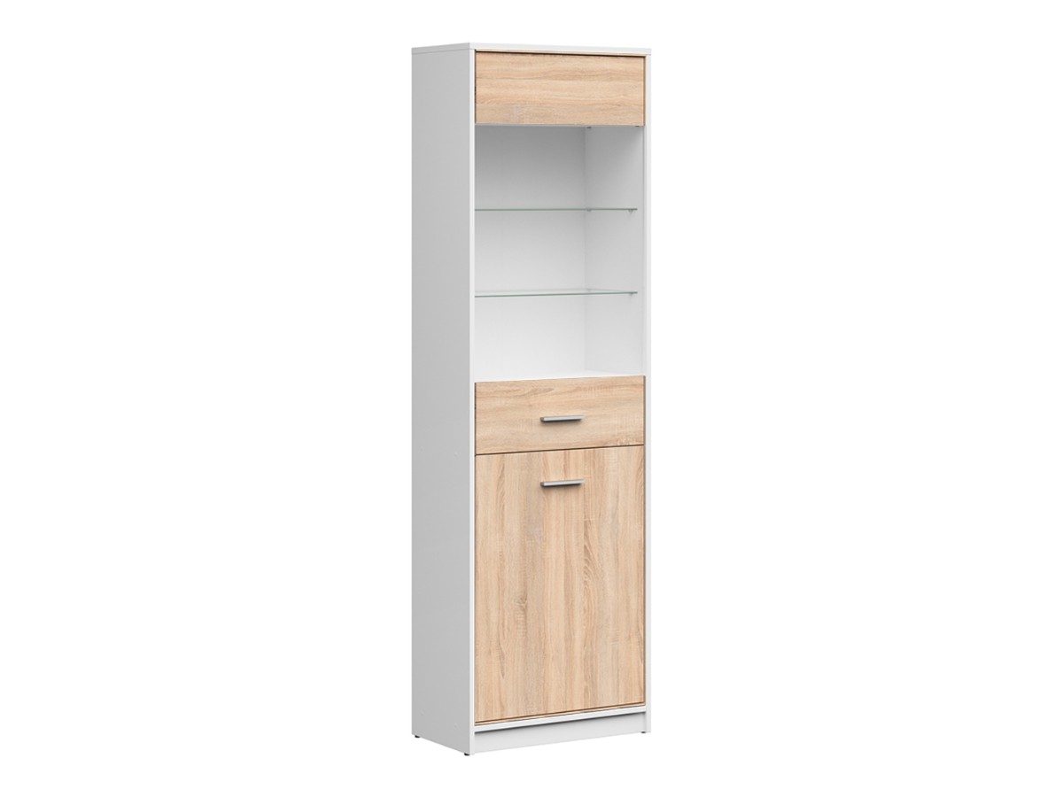 Vitrína NEPO PLUS je vyrobená z lamina v barvě bílá/dub sonoma. V nabídce také další barvy viz barevné varianty.