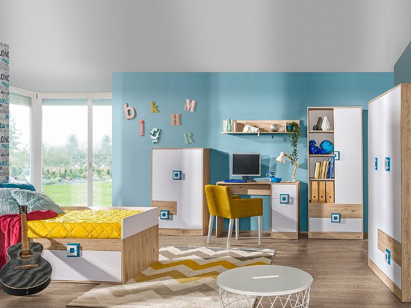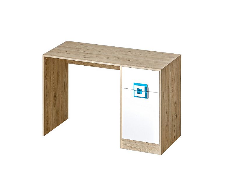 Psací stůl Nikos 10 je vyroben z lamina ve světlých tónech bílá/dub jasný. Úchyty jsou zhotoveny z tyrkysové barvy, která celý výraz nábytku prozáří. K dispozici je dostatečně veliká pracovní plocha, zásuvka a za dvířky ukrytá police.