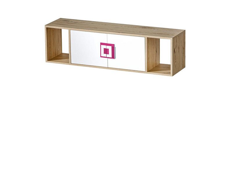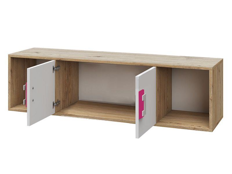 K výrobě skříňky Nikos bylo použito lamino v barevném provedení bílá/dub jasný - úchytka růžová. Součástí je uzavíratelná a otevřená část.