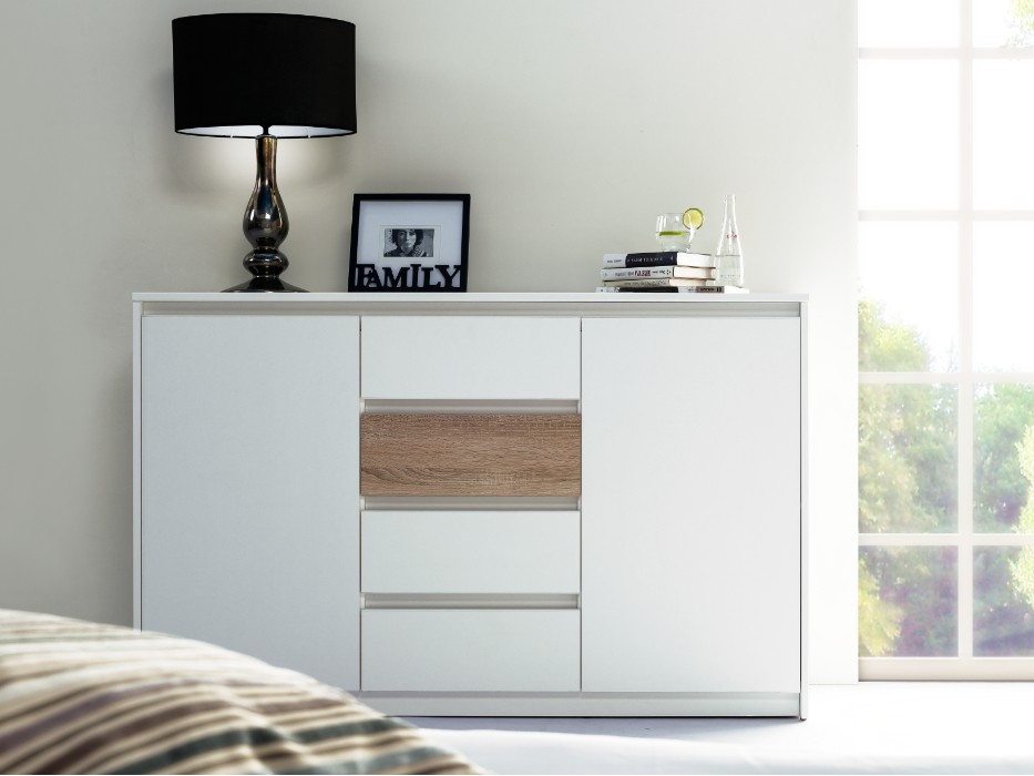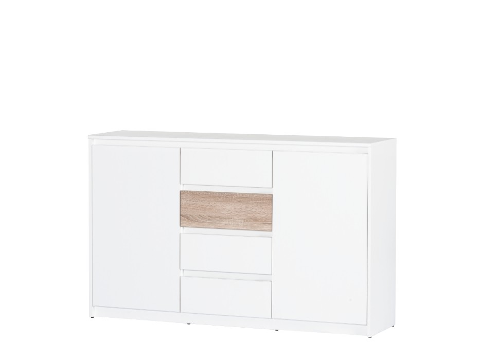 Komoda NORA je vyrobena z lamina v kombinaci barev bílá/dub sonoma. Jde o krásné, světlé provedení, opticky zvětšující prostor. Úložné místo je v podobě jedné police, uschované za dvířky a šuplíků usnadňující přehled v uložených věcech.