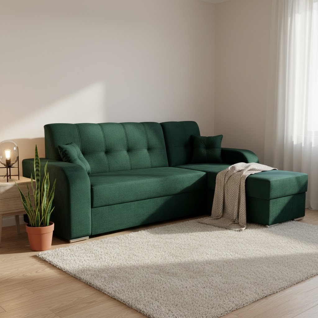 Barevné provedení sedací soupravy OLIVIA je v tmavě zeleném tónu. Látka je Monolith 37 - water repellent - snadné čištění, nevsakuje tekutinu. Čalouněna jsou také záda, možnost umístění do prostoru.