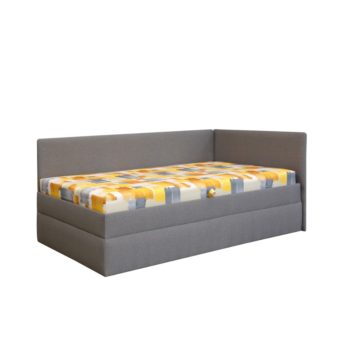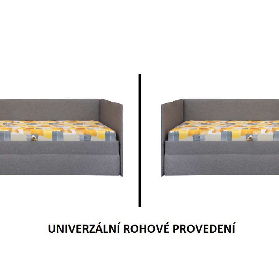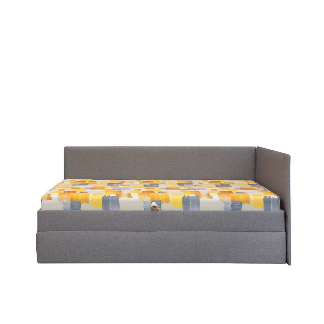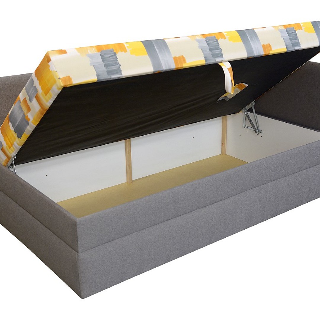 Barevné provedení válendy je v designovém potažení pružinové matrace. Látka je v odstínech žluté barvy. Korpus je šedý. Součástí je také pevný smrkový rošt s bočním výklopem (viz doplňkové ilustrační foto). Úložný prostor je extra hluboký, hodný k uschování lůžkovin nebo denních dek.