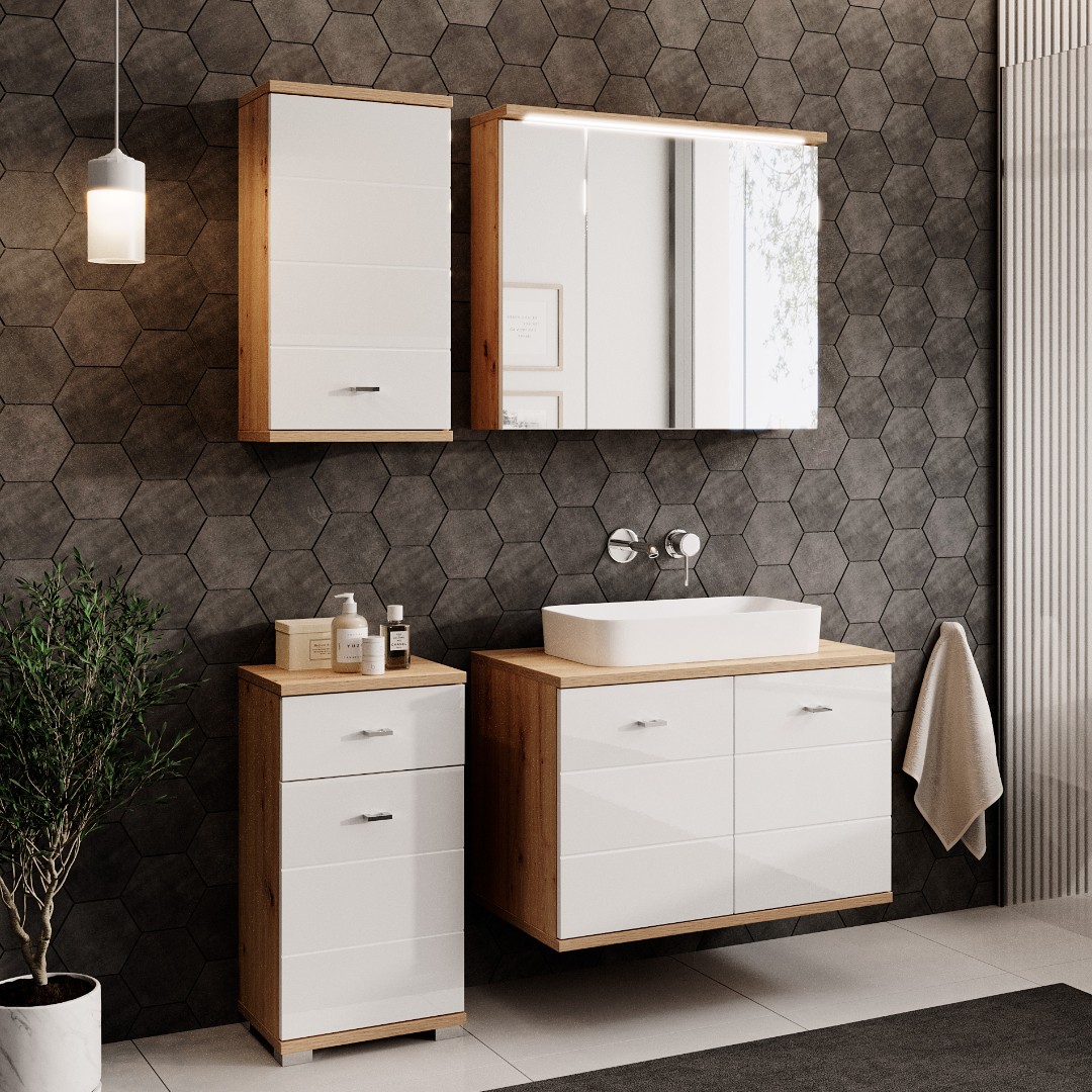 Tato koupelnová série poskytne spoustu nábytku pro plnohodnotné zařízení místnosti. Bude krásně sladěná, ve světlých barevných tónech, které opticky zvětšují a projasňují místnost.
