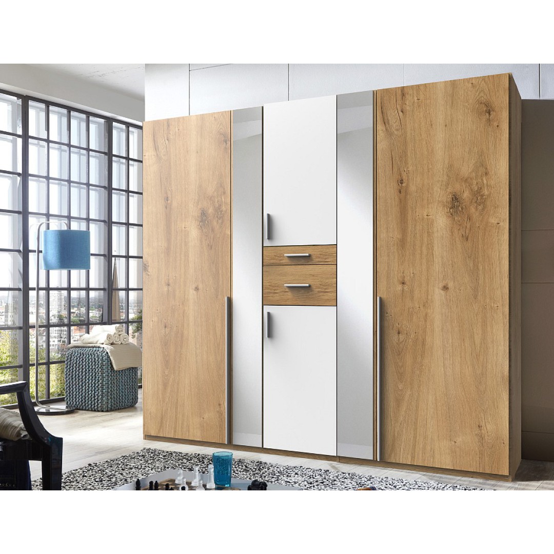 Šatní skříň OATAVA byla vyrobena z lamina v odstínu dub planket/bílá/zrcadlo. Tato barevná kombinace je stylová a okouzlí nejednu vaši návštěvu. Je skvělou volbou pro uložení velkého množství oděvu, ale také jiných nezbytností. Šuplíky jsou vhodné pro uschování toho nejmenšího oděvu nebo doplňků.