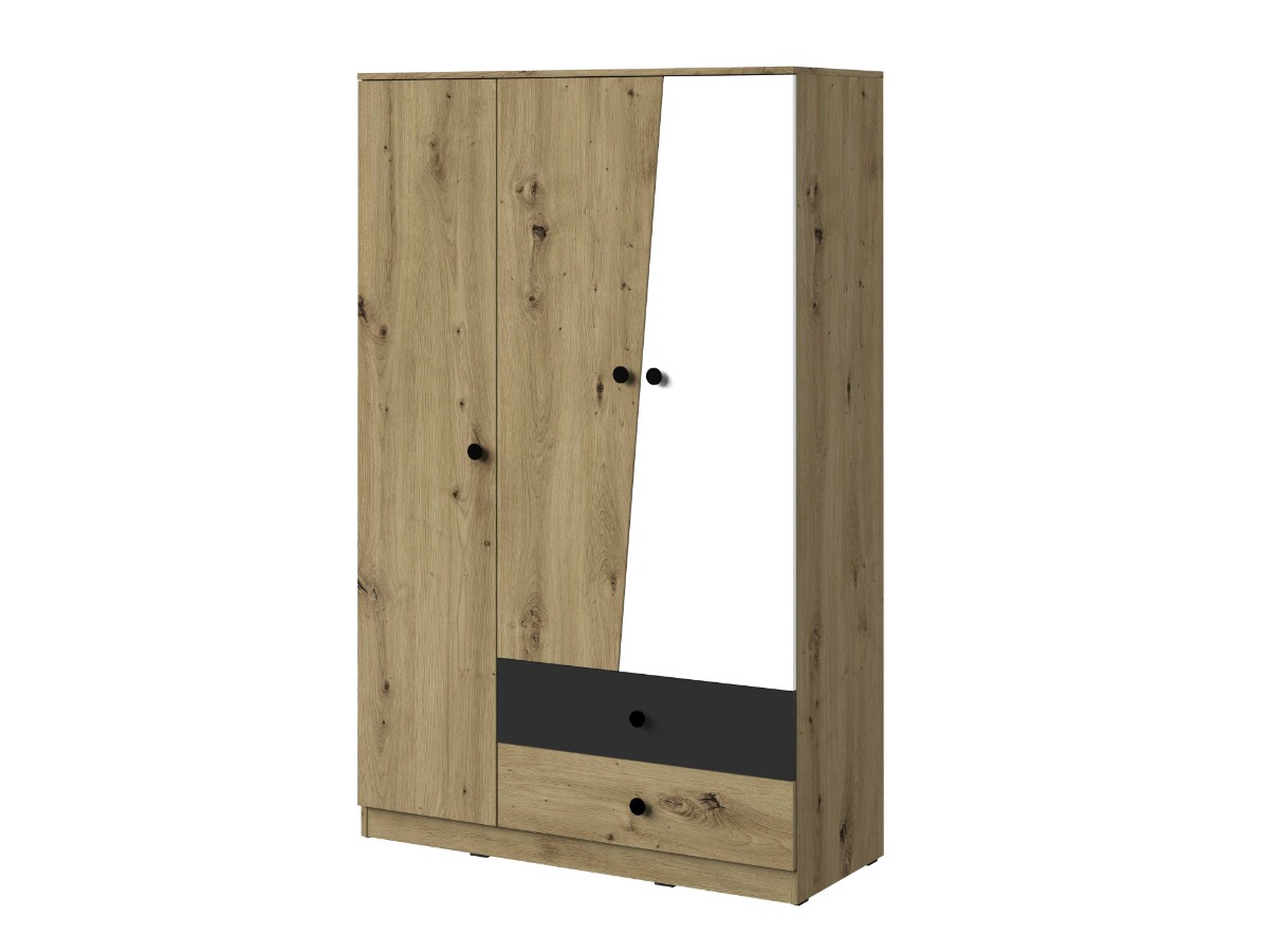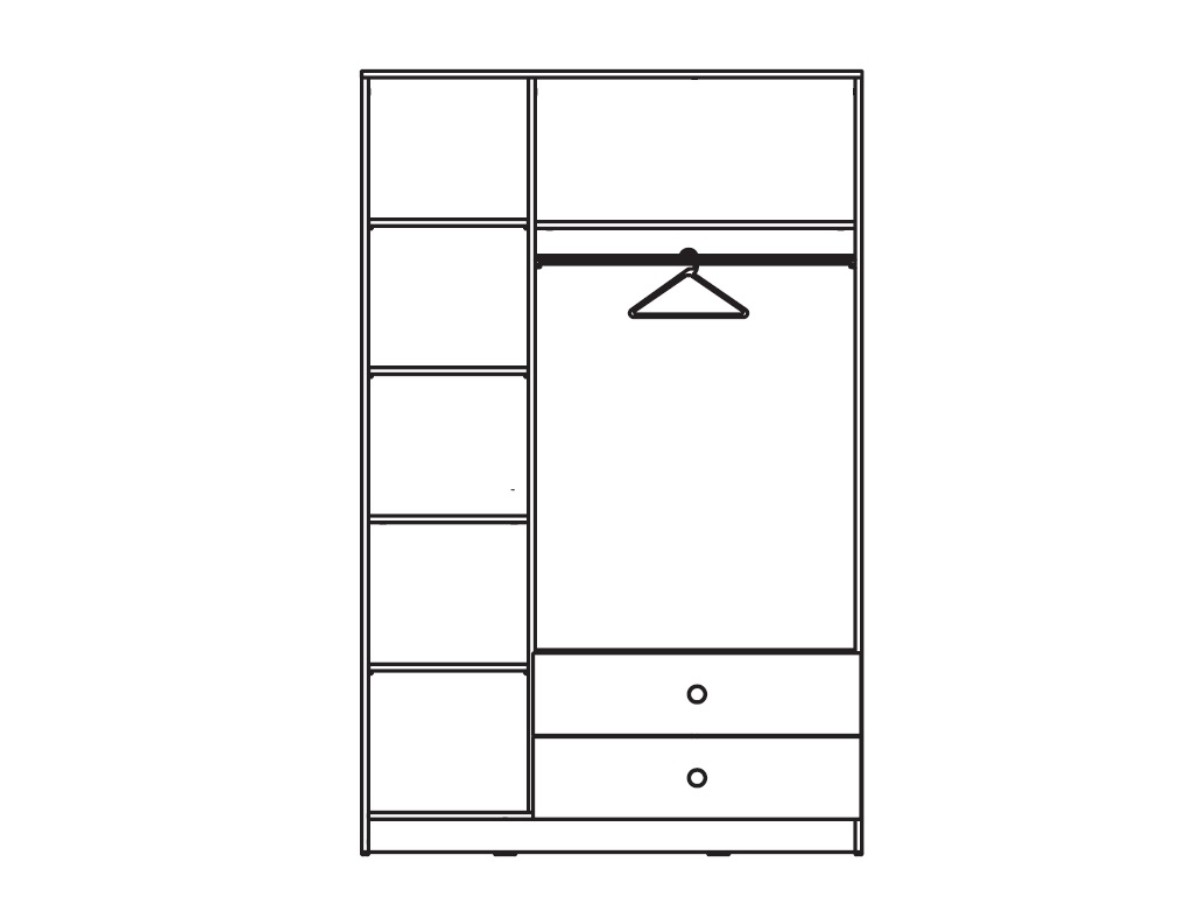 V užší části za dvířky je policový díl, do kterého jednoduše umístíte svetry, trička a jiné nezbytnosti. Do širší dvoukřídlové části umístíte kabáty, bundy a vše, co budete chtít mít pověšeno na ramínku. Tato část totiž obsahuje šatní tyč a jednu vrchní polici na maličkosti. Ve spodní části jsou k dispozici dvě zásuvky.