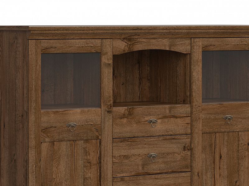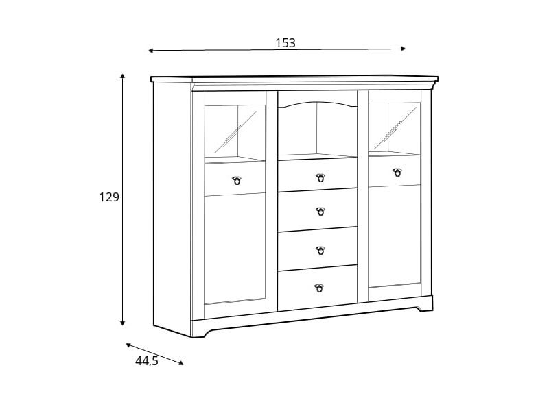 Vitrína Patras je rozdělena na tři části. Prostřední je šuplíková, po bocích se nachází za dvířky police a skleněný průhled vyrobený z tvrzeného skla. Možno dokoupit LED osvětlení (viz související zboží), které krásně v průhledech osvětlí dekorace.