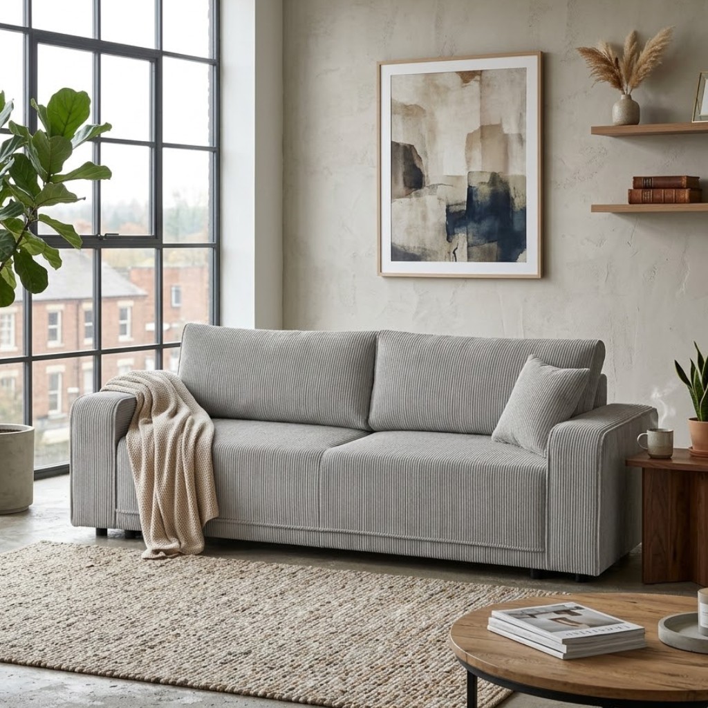 Pohovka PIREUS je vyrobena v béžovém tónu látky Poso 100. Tato látka je podobná manšestru, velmi hrubá, odolná proti žmolkování, s úpravou pet friendly - snadné odstranění zvířecích chlupů a vlasů.