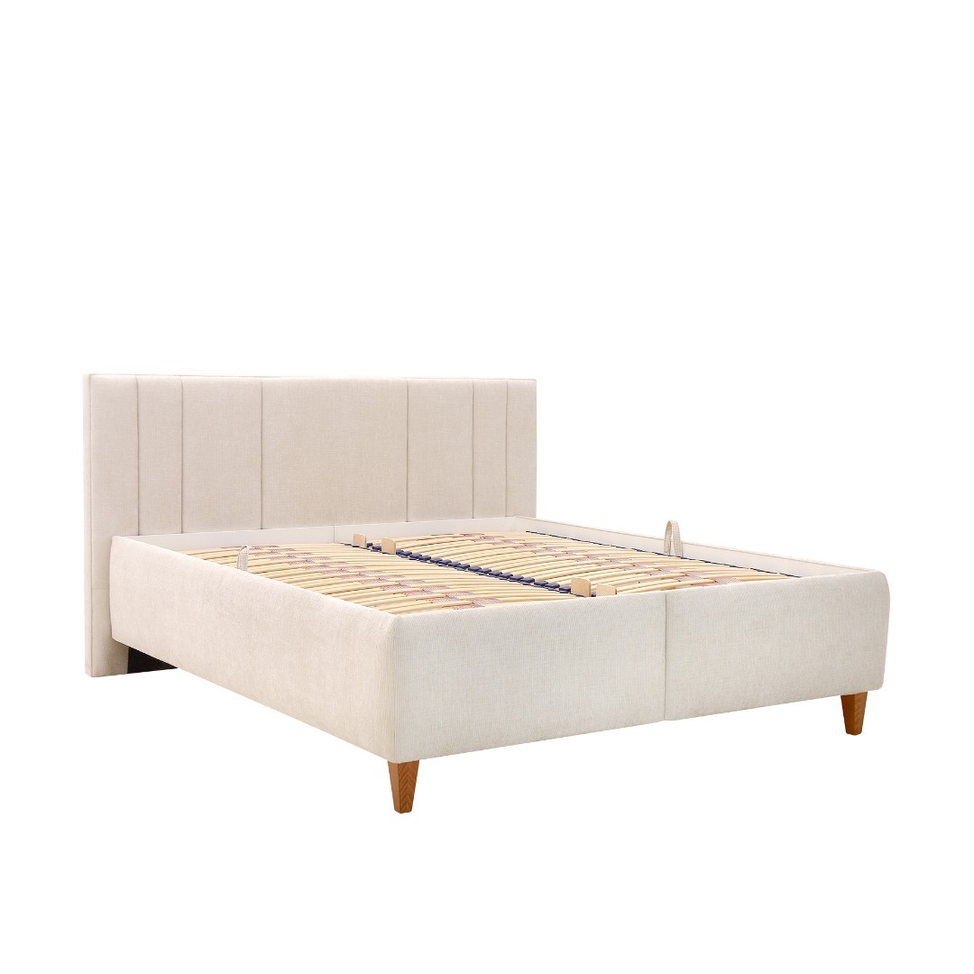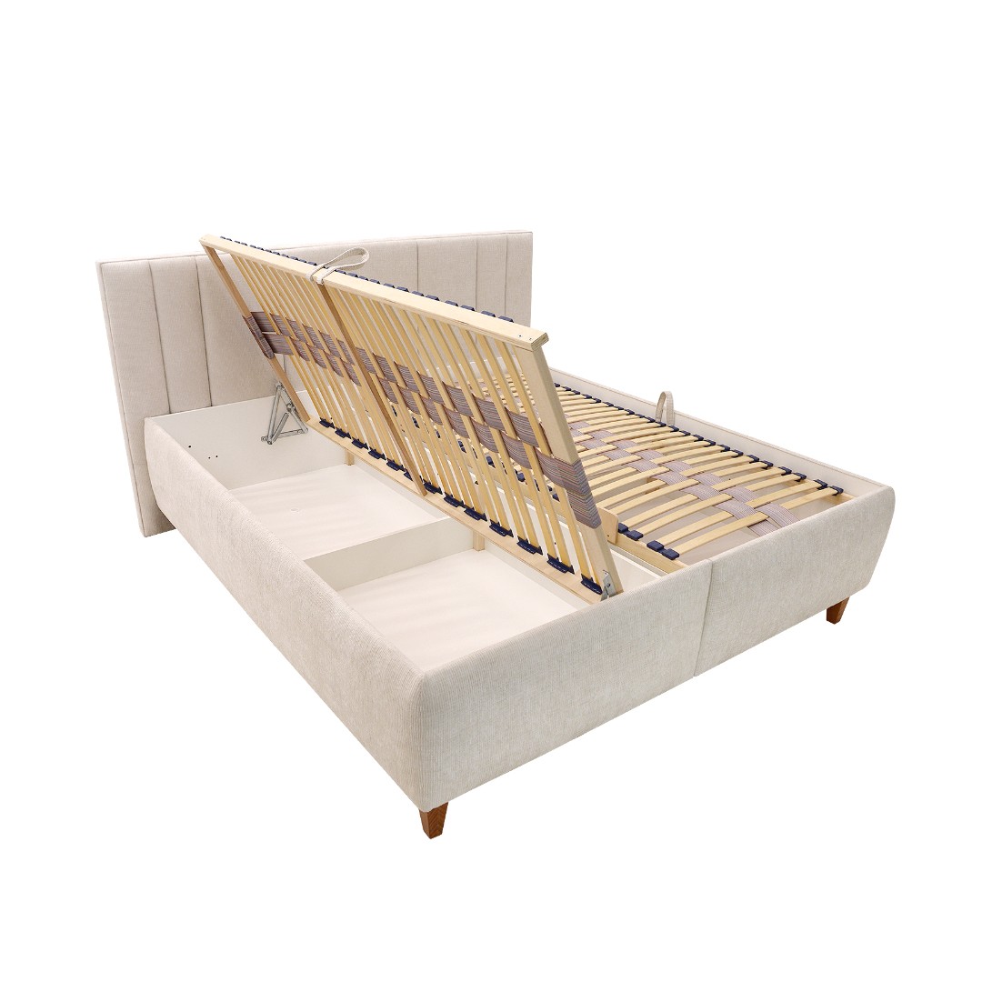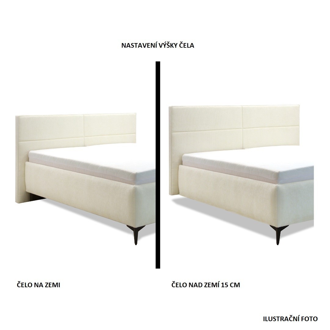 Barevné provedení postele je v tónu bílá káva látky Sierra 745. V ceně postele jsou výklopné rošty z boku - upevněny na pneu pístu, pod nimiž najdete velkorysý úložný prostor pro lůžkoviny i sezónní věci. U čalouněného čela si můžete sami zvolit, zda bude čelo stát přímo na zemi, nebo bude vyvýšené podle výšky nožiček (15 cm - dřevěné nožky). Extra vysoká nosnost postele až 150 Kg na osobu.