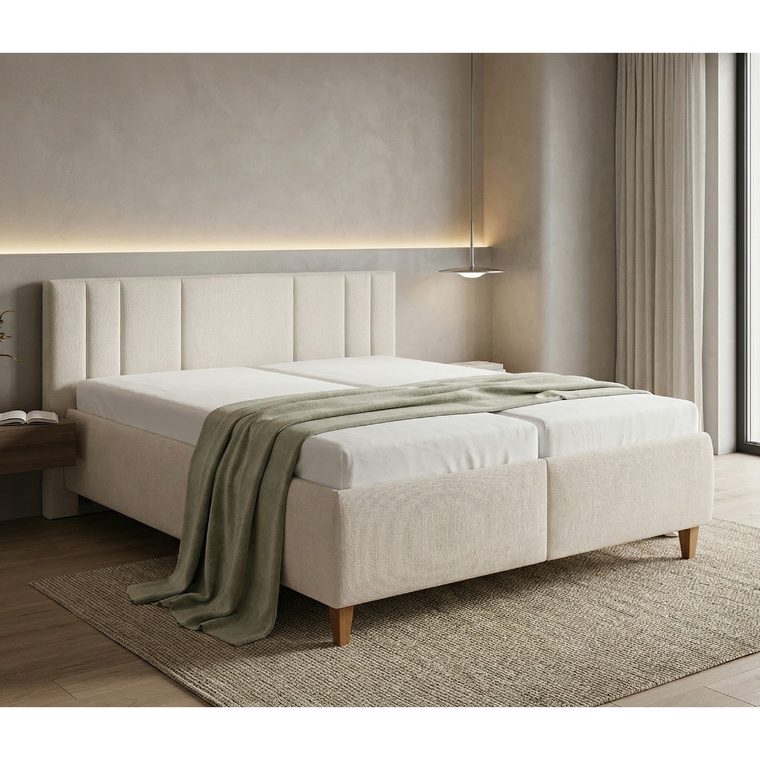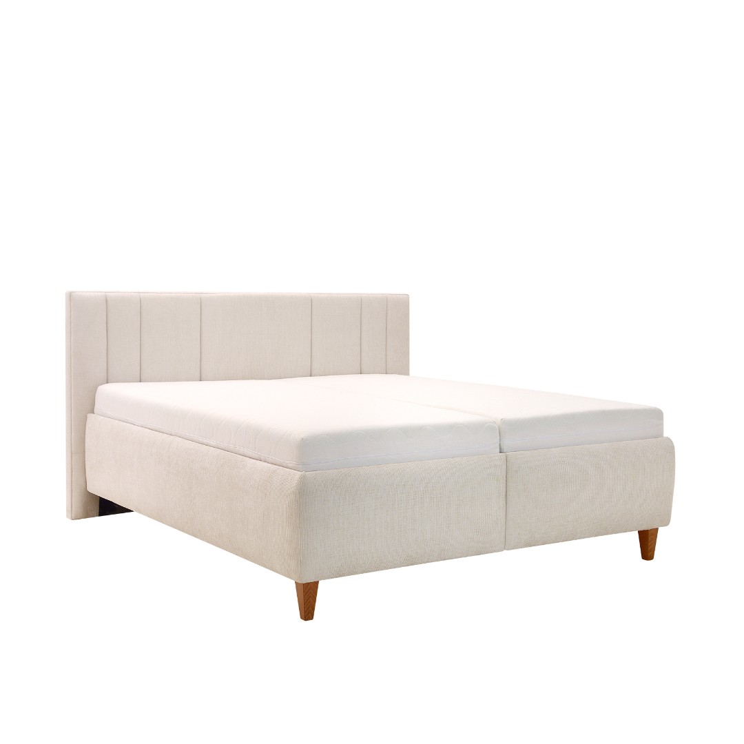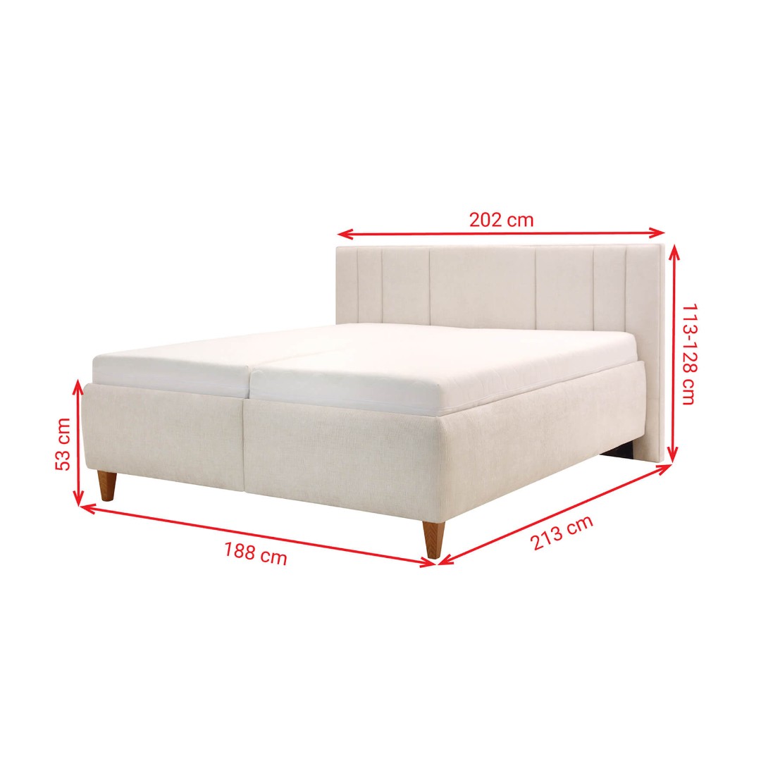 Barevné provedení postele je v tónu bílá káva látky Sierra 745. V ceně postele jsou výklopné rošty z boku - upevněny na pneu pístu, pod nimiž najdete velkorysý úložný prostor pro lůžkoviny i sezónní věci. U čalouněného čela si můžete sami zvolit, zda bude čelo stát přímo na zemi, nebo bude vyvýšené podle výšky nožiček (15 cm - dřevěné nožky). Extra vysoká nosnost postele až 150 Kg na osobu.
