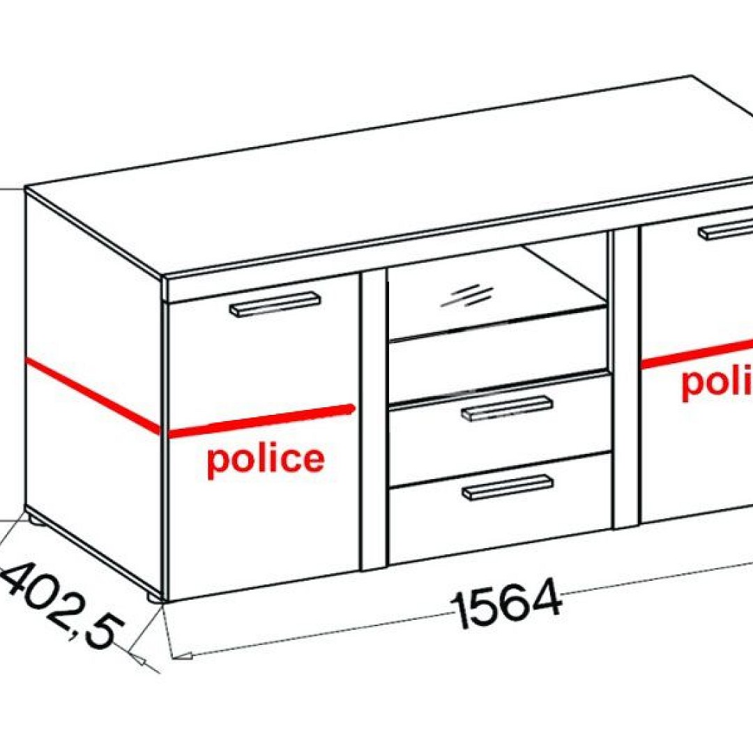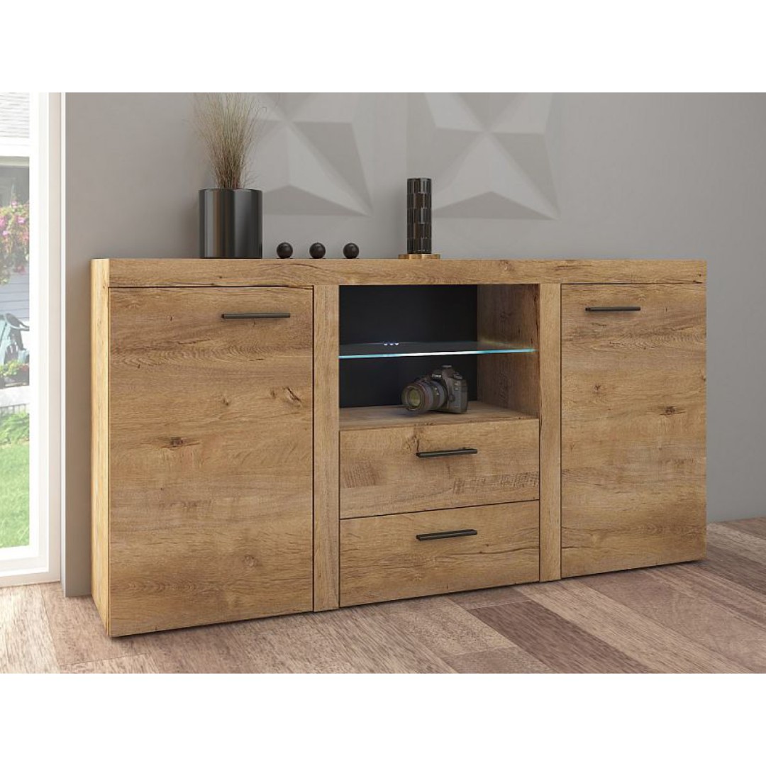 Komoda je rozdělena na tři části. Po bocích se nacházejí za dvířky police. V prostřední části je prosklená police, kterou je možné doplnit o LED osvětlení.