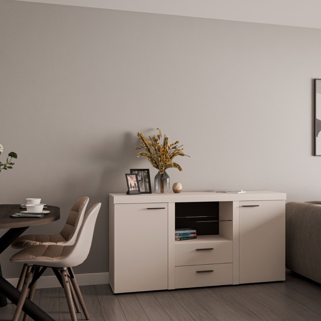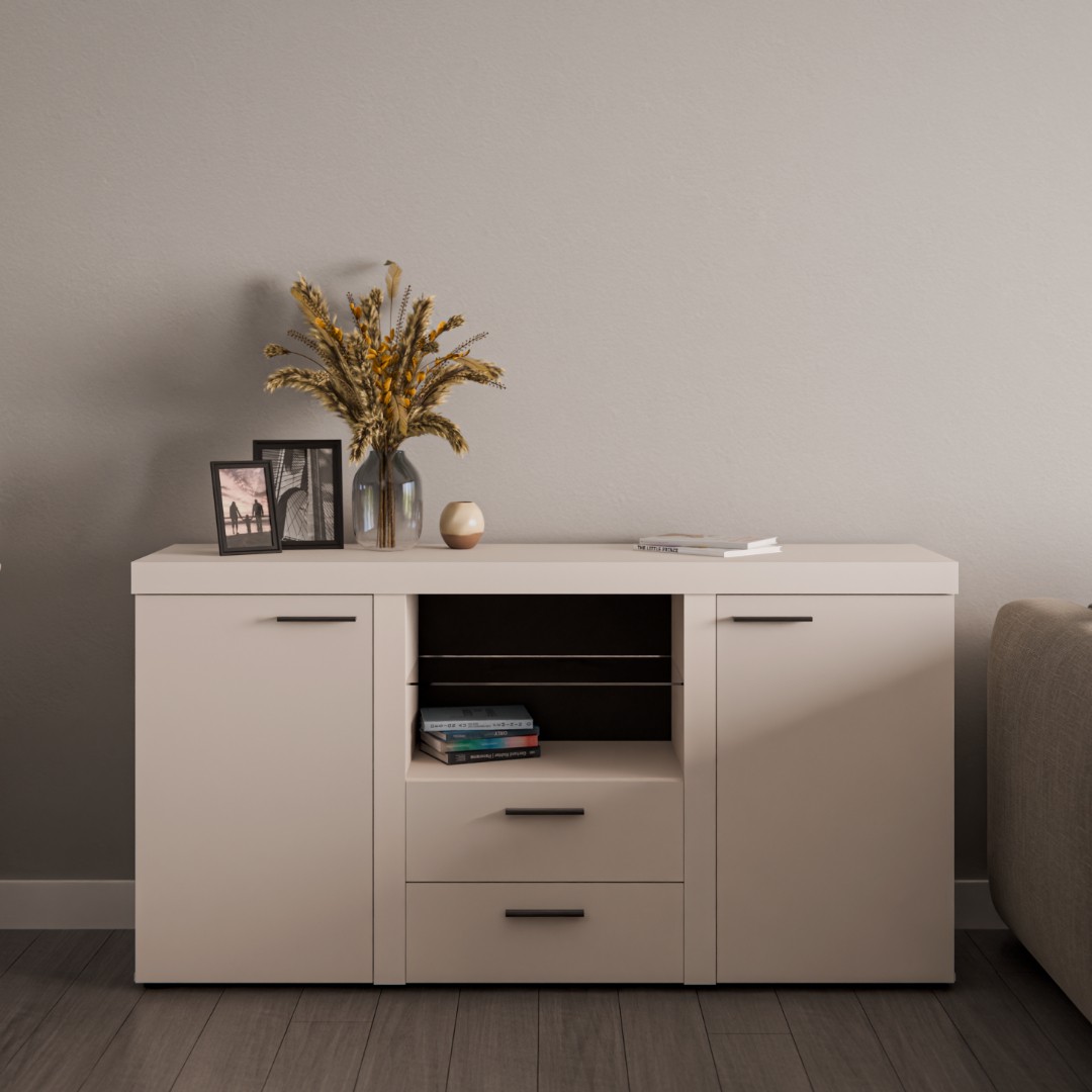 Komoda Robben je vyrobena z lamina v pískovém barevném provedení. Komoda je rozdělena na tři části. Po bocích se nacházejí za dvířky police. V prostřední části je prosklená police, kterou je možné doplnit o LED osvětlení. Dále jsou k dispozici dvě zásuvky na kvalitních pojezdech. Dvířka jsou opatřeny praktickými úchyty pro snadnější manipulaci při otevírání.