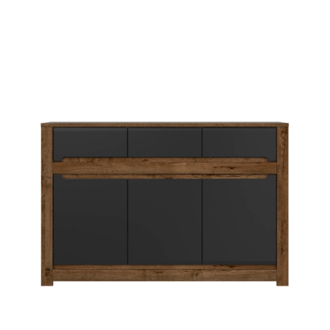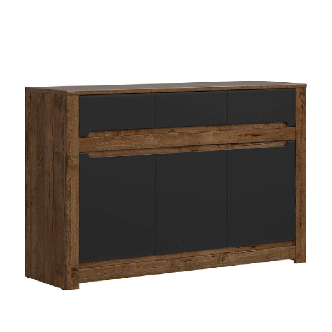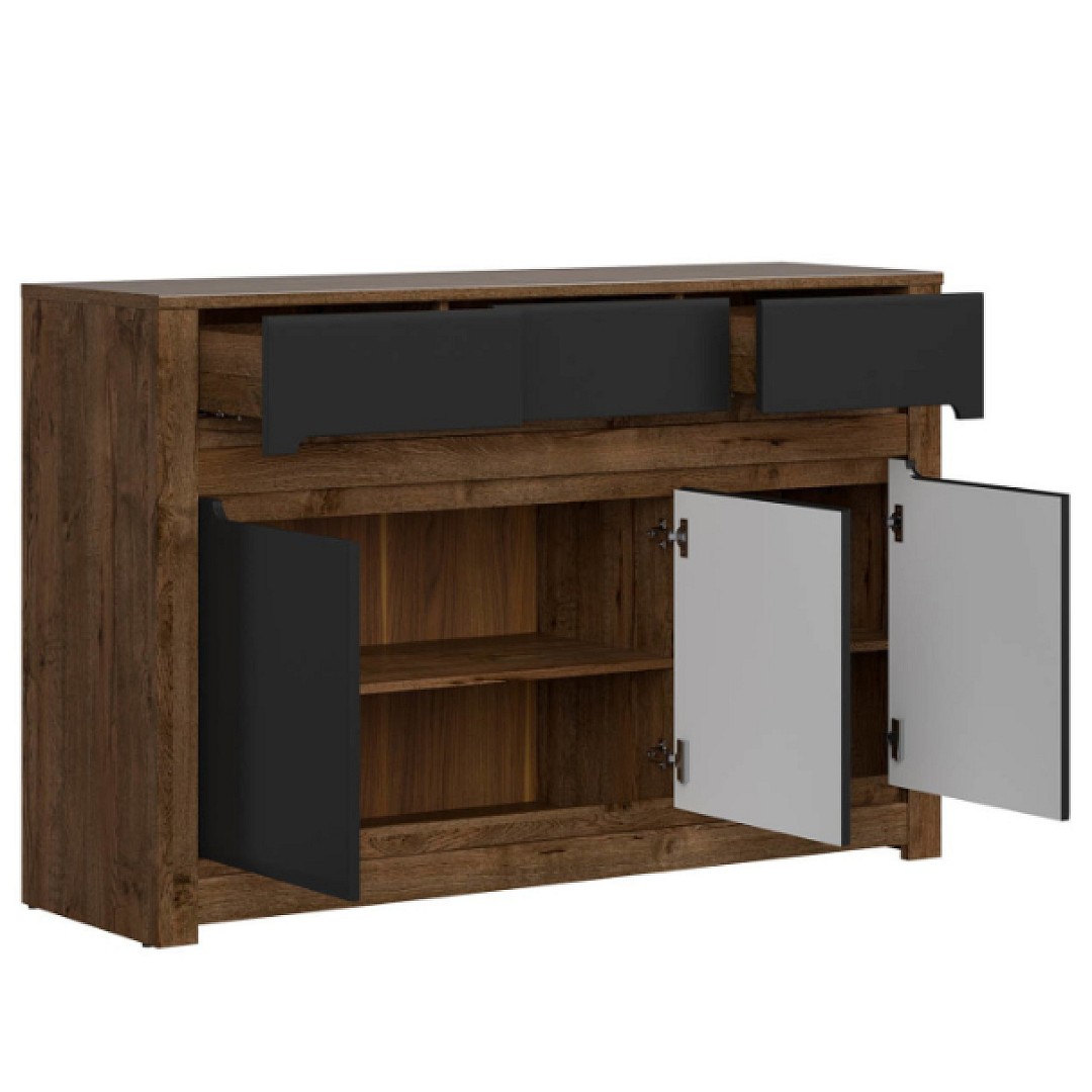 Komoda Ruso je vyrobena v barevném provedení Dub April/černá mat. Má tři praktické zásuvky a za dvířky police. Prostornou vrchní část je možné využít pro vystavení dekoračních předmětů - fotografií z dovolené nebo například trofeje.