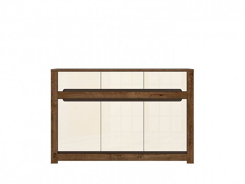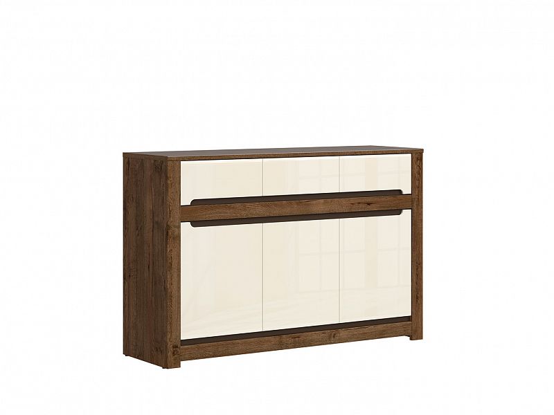 Komoda Ruso je vyrobena v barevném provedení Dub April/Perleťový lesk. Má tři praktické zásuvky a za dvířky police. Prostornou vrchní část je možné využít pro vystavení dekoračních předmětů - fotografií z dovolené nebo například trofeje.