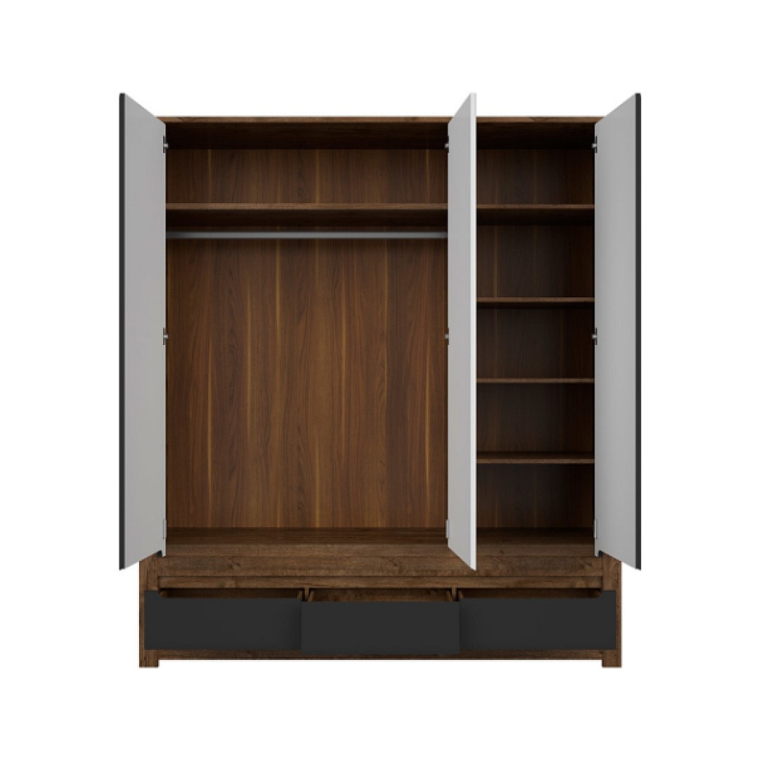 Vnitřní uspořádání skříně je v podobě polic a šatní tyče. Ve spodní části jsou k dispozici zásuvky. Pro snadnější manipulaci jsou k dispozici frézované úchyty.