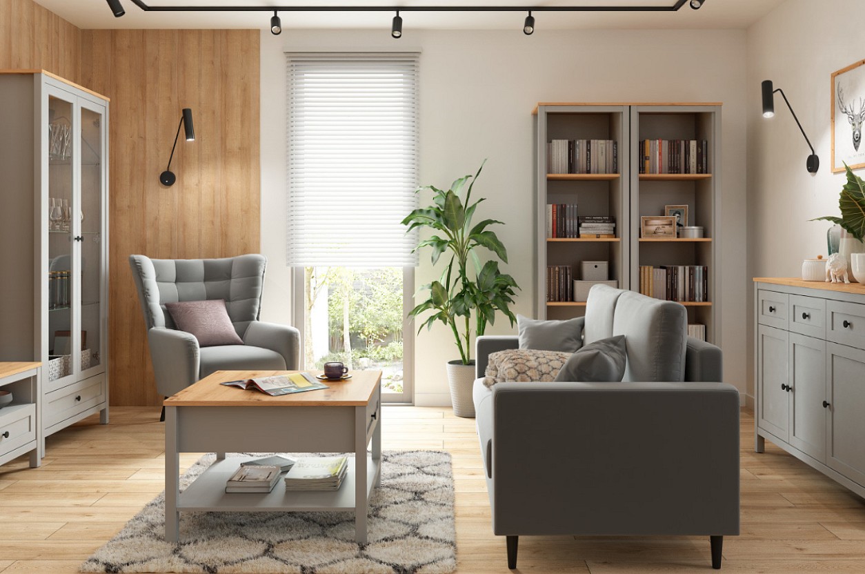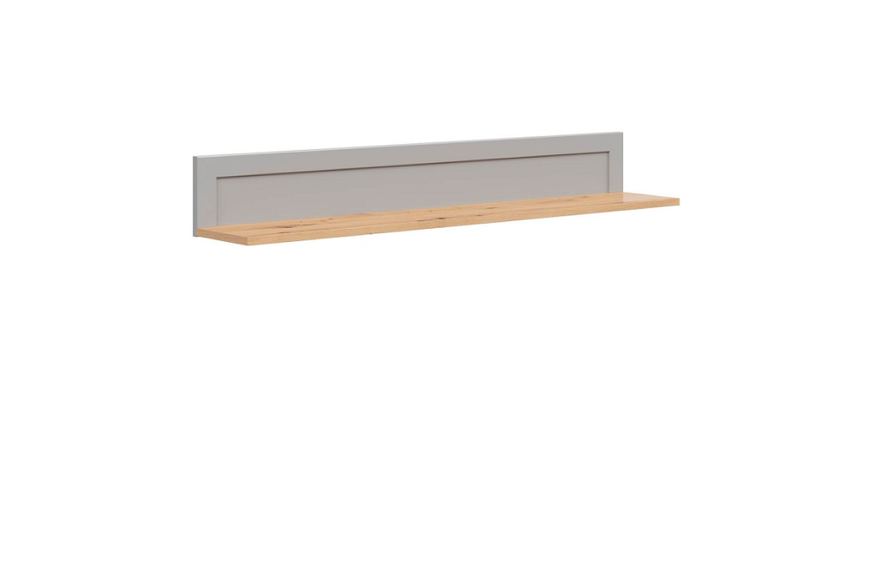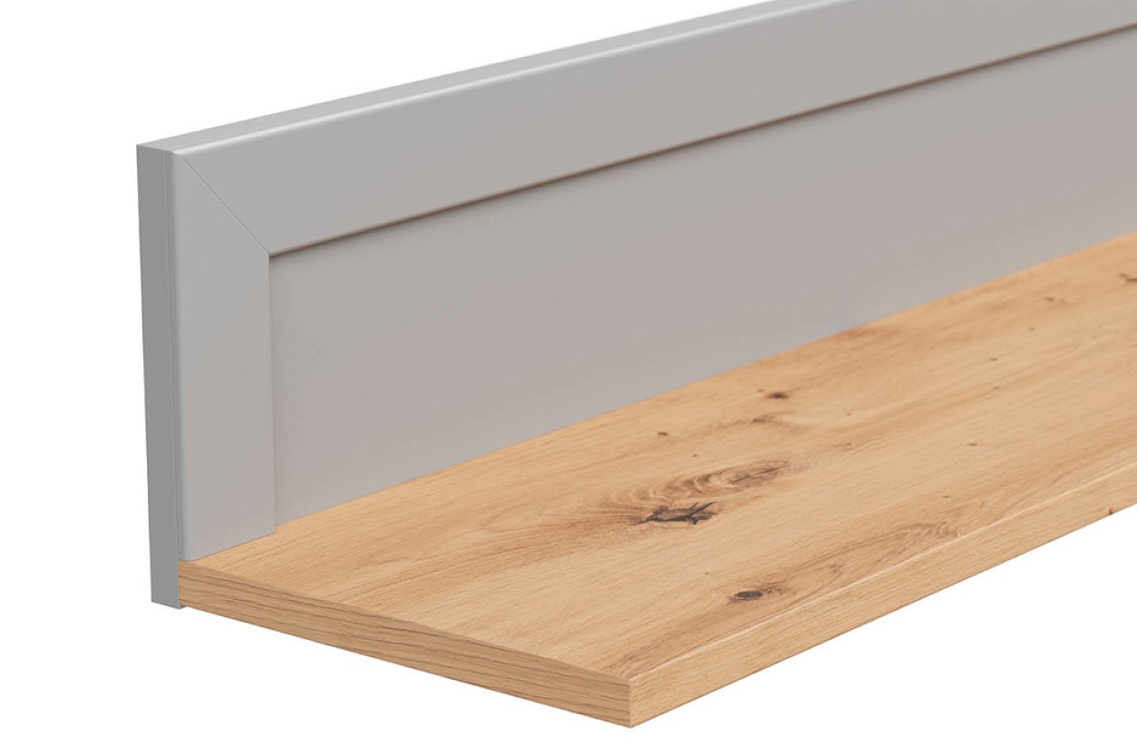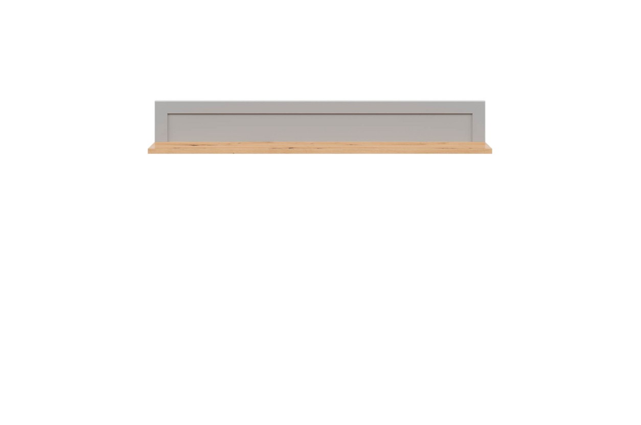 Barevné provedení police SALGA je v kombinaci tónů šedá arktisgrau/dub artisan. Šedá část nábytku je dekorována ozdobnými lištami. K dispozici má odkládací plochu šířky 22 cm. Vhodná pro vystavení dekoračních předmětů.