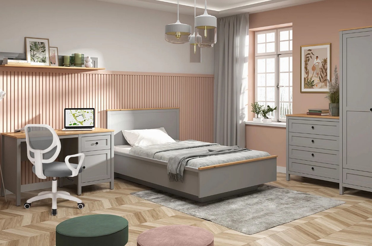 Tento nábytek je vyrobený ve skandinávském stylu. Má světlé barevné provedení. Je dekorován ozdobnými lištami a knoflíkovými úchyty, což je pro tuto kolekci typické.