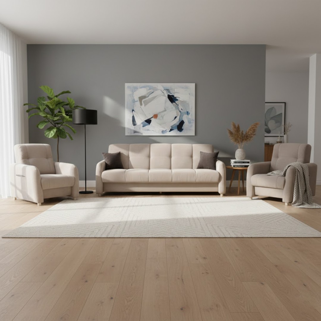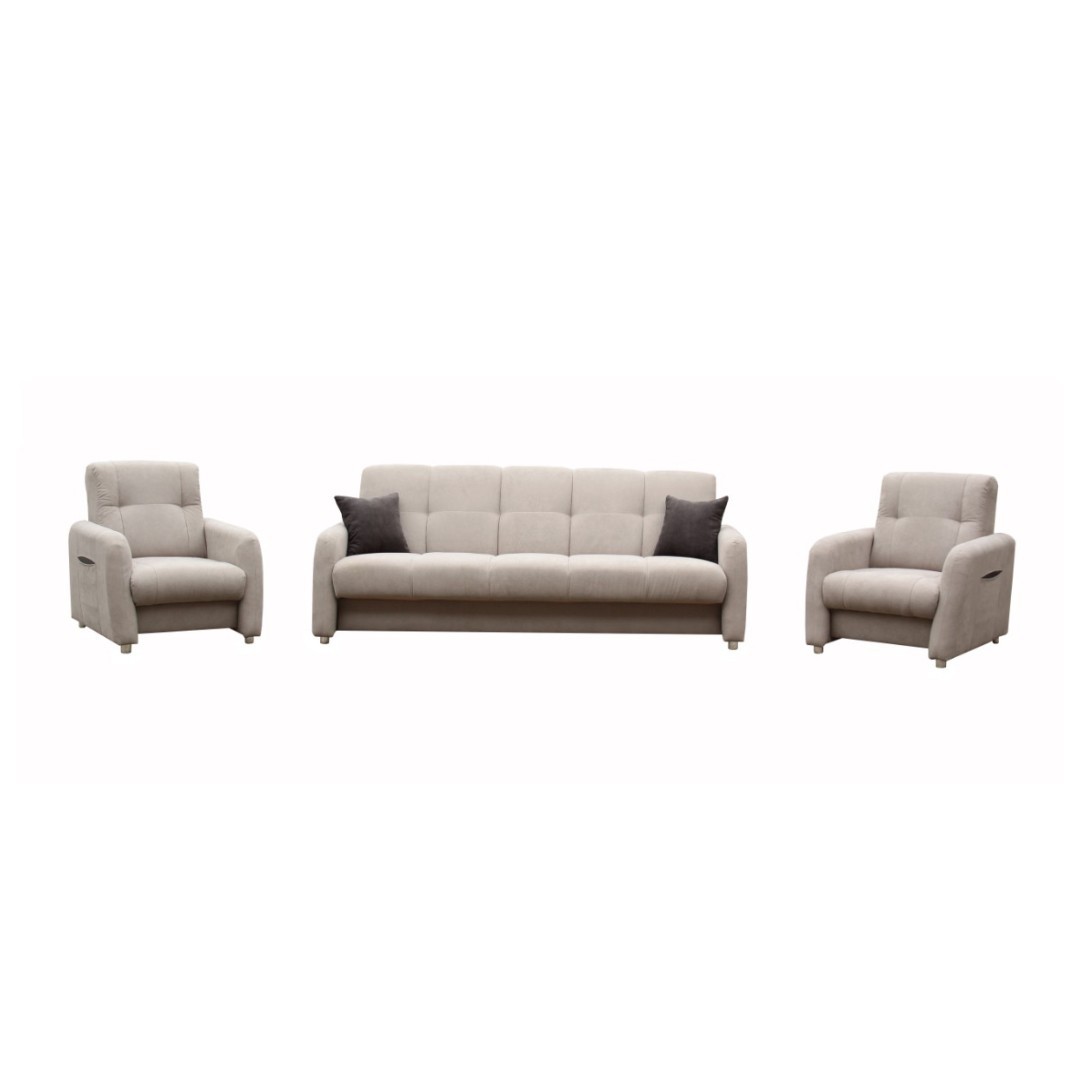 Představujeme vám elegantní sestavu pohovky a křesel Sali, která zaujme svou kvalitou a vkusným designem. Tato sestava je v provedení v krásné béžové barvě SORO 23, doplněnou o hnědé polštářky SORO 96...