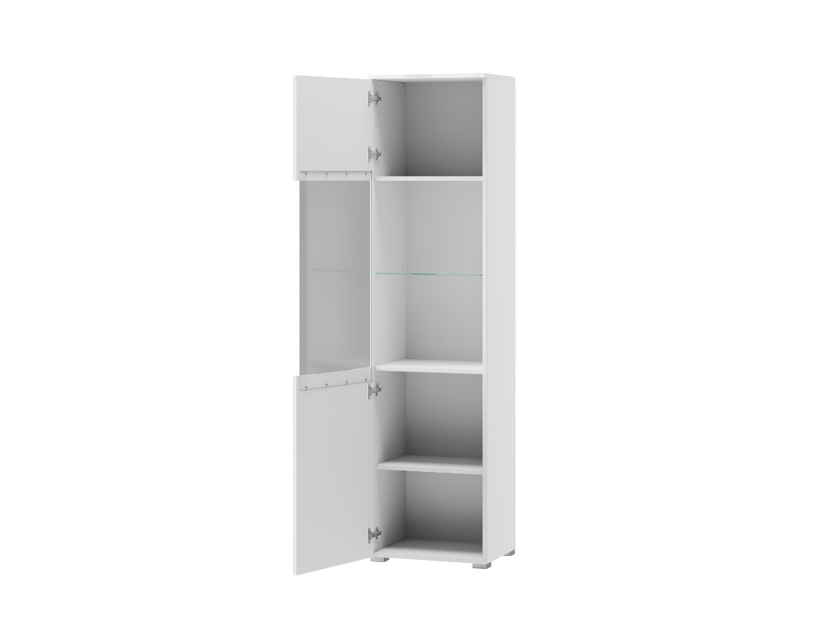 Vitrína má prosklenou a plnou část dvířek. Za prosklenou částí je umístěna police z tvrzeného skla. Zbylé tři police jsou z lamina. Kostra vitríny je vyrobena z kvalitní MDF desky s bílou PVC fólií, odolnou proti poškrábání. (bílý mat korpus, lesk přední část).