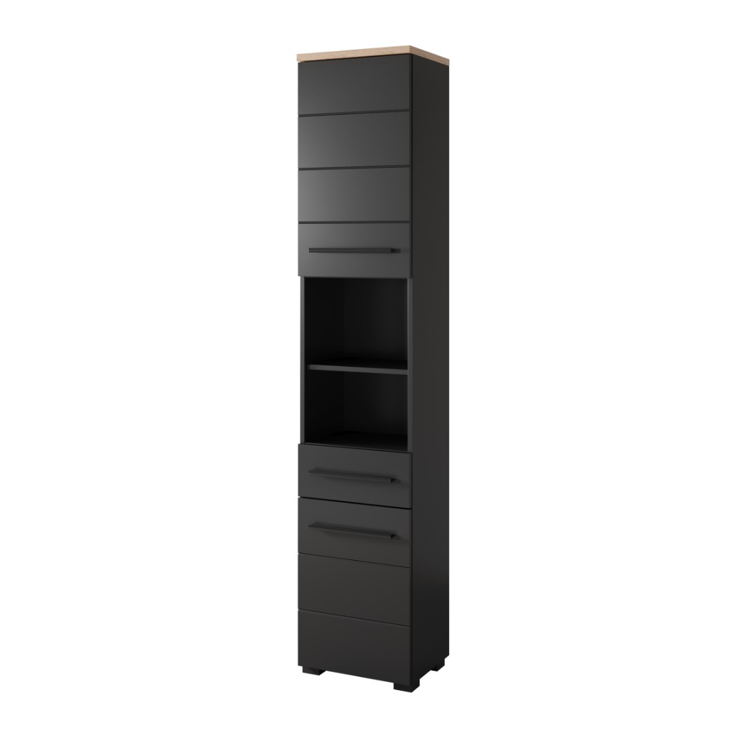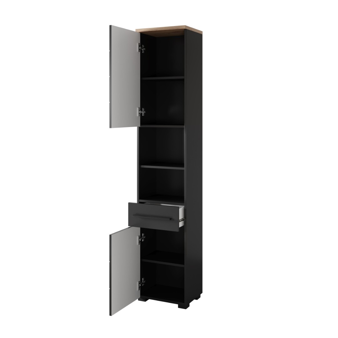 Uvnitř skříňky se nacházejí praktické police, které usnadňují přehledné uspořádání kosmetiky, hygienických potřeb nebo dalších drobností. Nechybí ani malý šuplík pro nejmenší drobnosti. Vyrobeno z lamina + MDF dvířek v barevném provedení dub artisan/černá mat. Dvířka mají úchytky černé barvy.