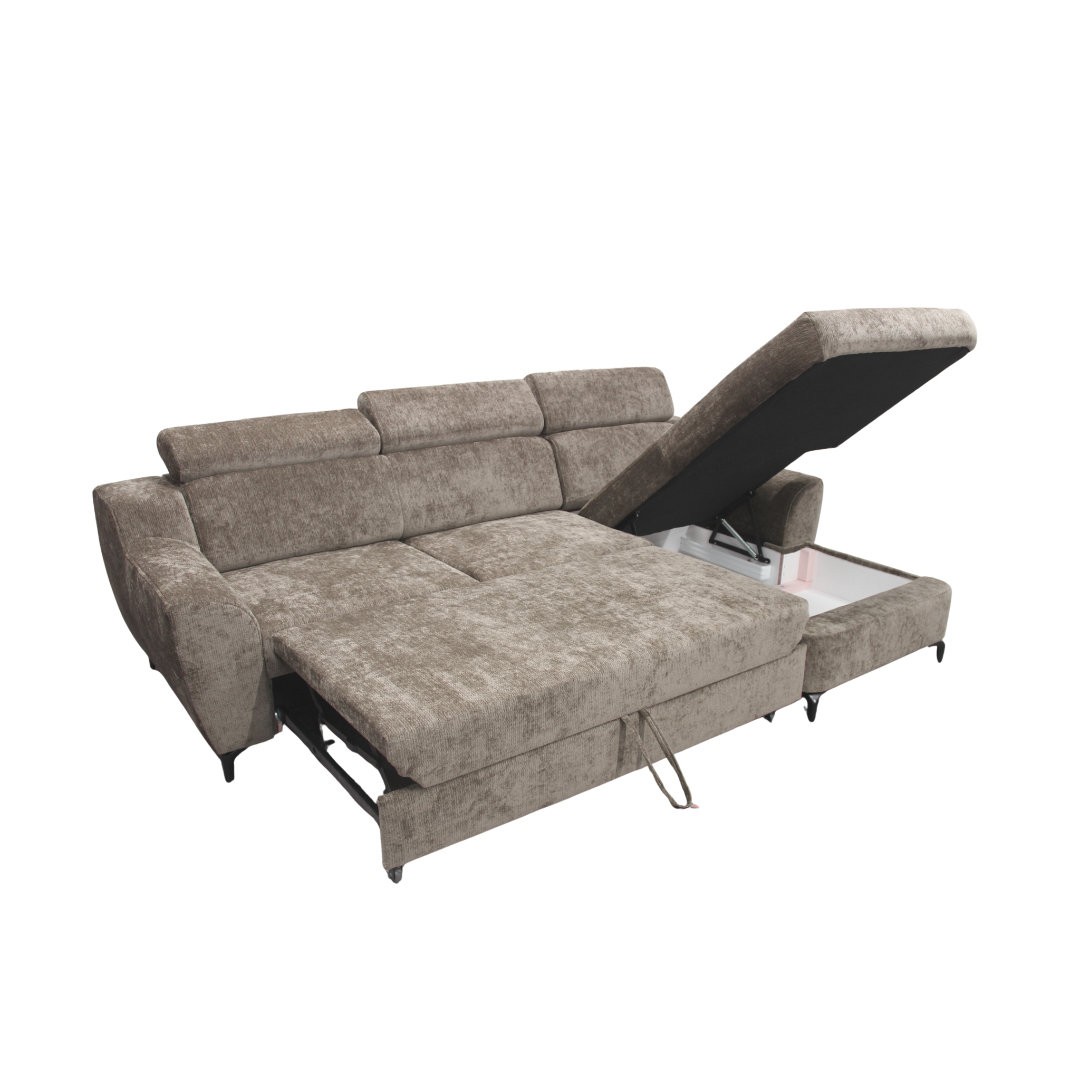 Výplň sedací soupravy je z polyuretanu, zajišťuje ideální pohodlí a zároveň tvarovou stálost. Sedák ve výšce 43 cm umožňuje posed, ze kterého se snadno vstává. Standardní hloubka sedu 55 cm. Doplněno o prostorný otoman s hloubkou 130 cm – ideální místo pro filmové maratony nebo odpolední šlofík. Díky 10 cm vysokým nožkám působí sedačka lehce a elegantně. Navíc tento prostor oceníte při úklidu – pod sedačku se snadno dostane většina robotických vysavačů. V případě, že potřebujete občas ubytovat návštěvu, skrývá tato sedačka praktický rozklad, který vytvoří velkorysou spací plochu o rozměrech 123 x 212 cm.