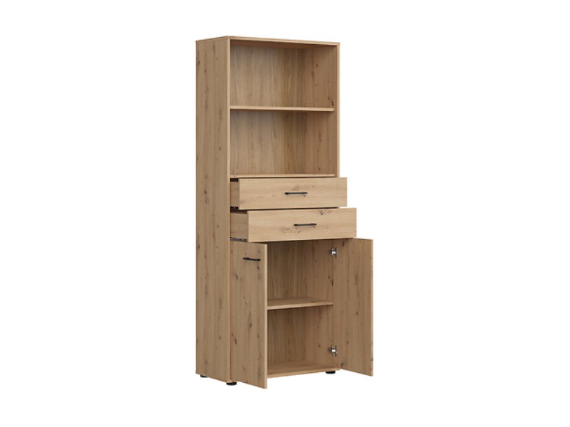 Regál je částečně otevřený kdy nabízí k uložení věcí polici. Pod otevřenou částí jsou k dispozici zásuvky s plynulým dojezdem a skříňka s panty tichého dovírání. I ve spodní části za dvířky naleznete polici.