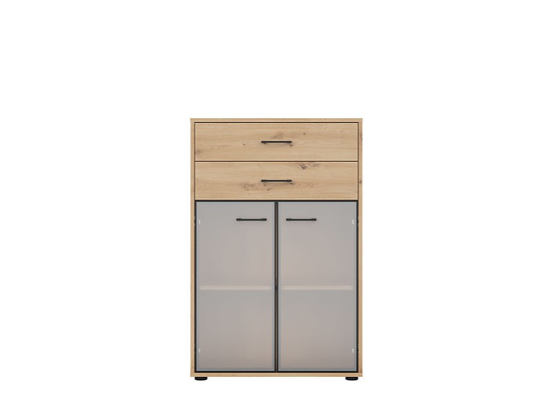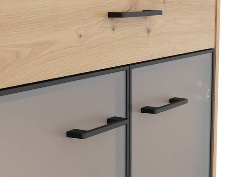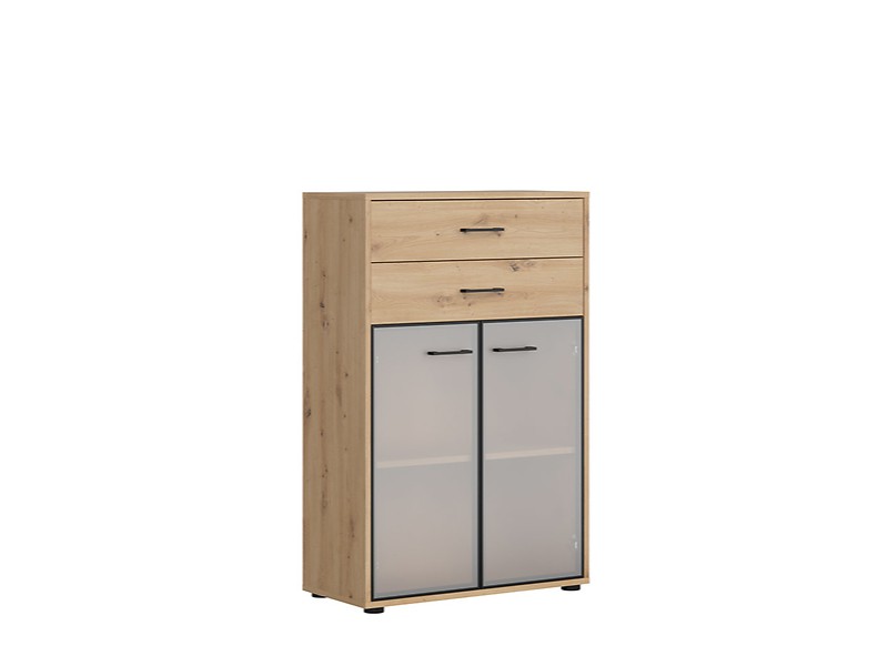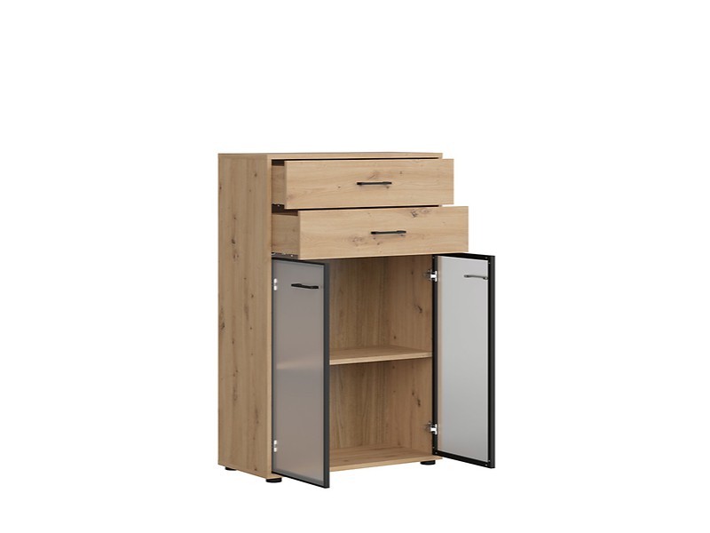 Vitrína SPACE OFFICE je zhotovená z lamina v barevném provedení dub artisan. Dvířka mají k dispozici panty s tichým otevíráním a úzké úchytky černé barvy. Nechybí ani mléčné sklo v černém hliníkovém rámu.