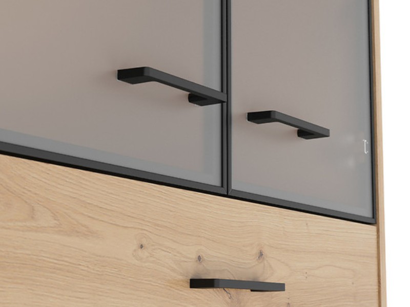 Úložný prostor je v podobě polic a zásuvek. Police jsou jak v otevřené, tak uzavřené části. Dvířka jsou opatřeny mléčným sklem vsazeným do hliníkového černého rámu. Úchytky jsou černé barvy.