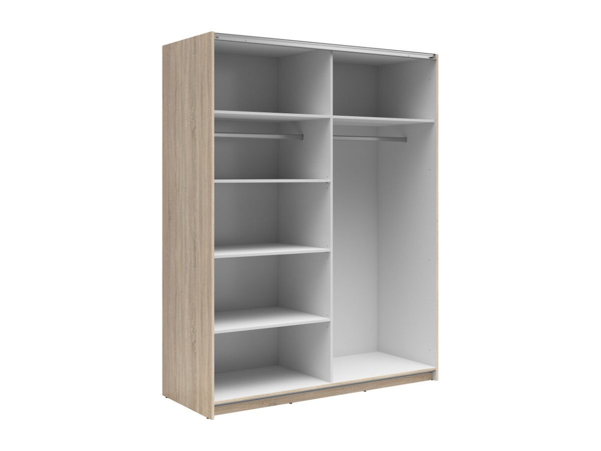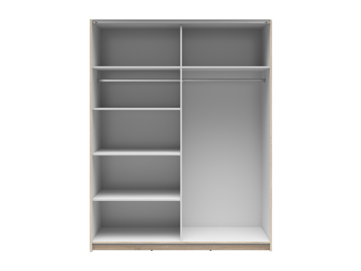 Skříň je vyrobená v barvě dub sonoma. V nabídce máme k dispozici také další barvy. Vybrat si můžete z barevných variant. Laminovaný povrch je odolný vůči mechanickému opotřebení, snadno se udržuje. Vnitřní prostor je potažený plátnem šedé barvy s jemnou strukturou.
